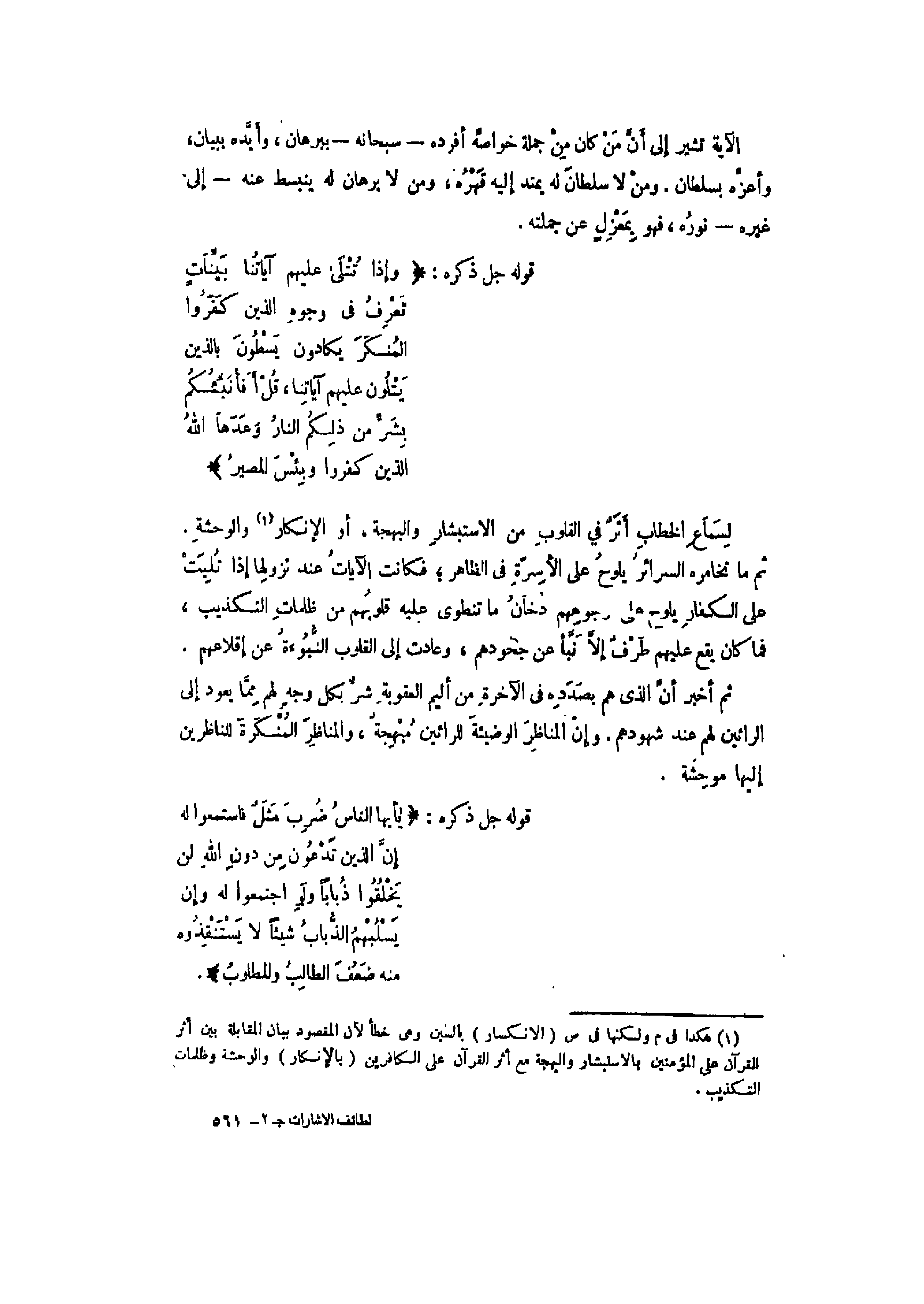 (1) هكذا فى م ولكنها فى ص (الانكسار) بالسين وهى خطأ لأن المقصود بيان المقابلة بين أثر القرآن على المؤمنين بالاستبشار والبهجة مع أثر القرآن على الكافرين (بالإنكار) والوحشة وظلمات التكذيب.