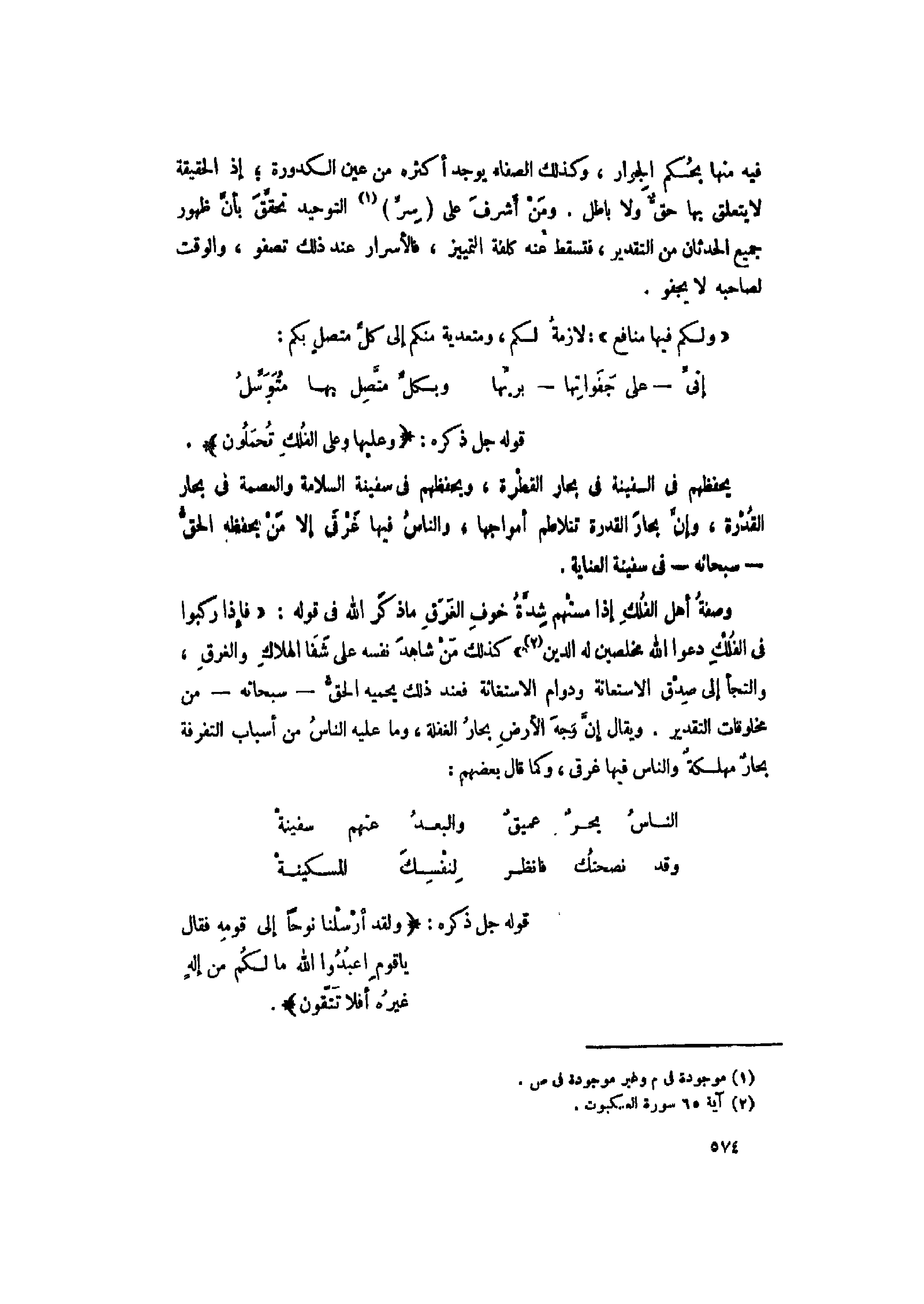 وصفة أهل الفلك إذا مستهم شدّة خوف الغرق ما ذكر الله فى قوله: «فَإِذا رَكِبُوا فِي الْفُلْكِ دَعَوُا اللَّهَ مُخْلِصِينَ لَهُ الدِّينَ «2» » كذلك من شاهد نفسه على شفا الهلاك والغرق، والتجأ إلى صدق الاستعانة ودوام الاستغاثة فعند ذلك يحميه الحقّ- سبحانه- من مخلوقات التقدير. ويقال إنّ وجه الأرض بحار الغفلة، وما عليه الناس من أسباب التفرقة بحار مهلكة والناس فيها غرقى، وكما قال بعضهم: