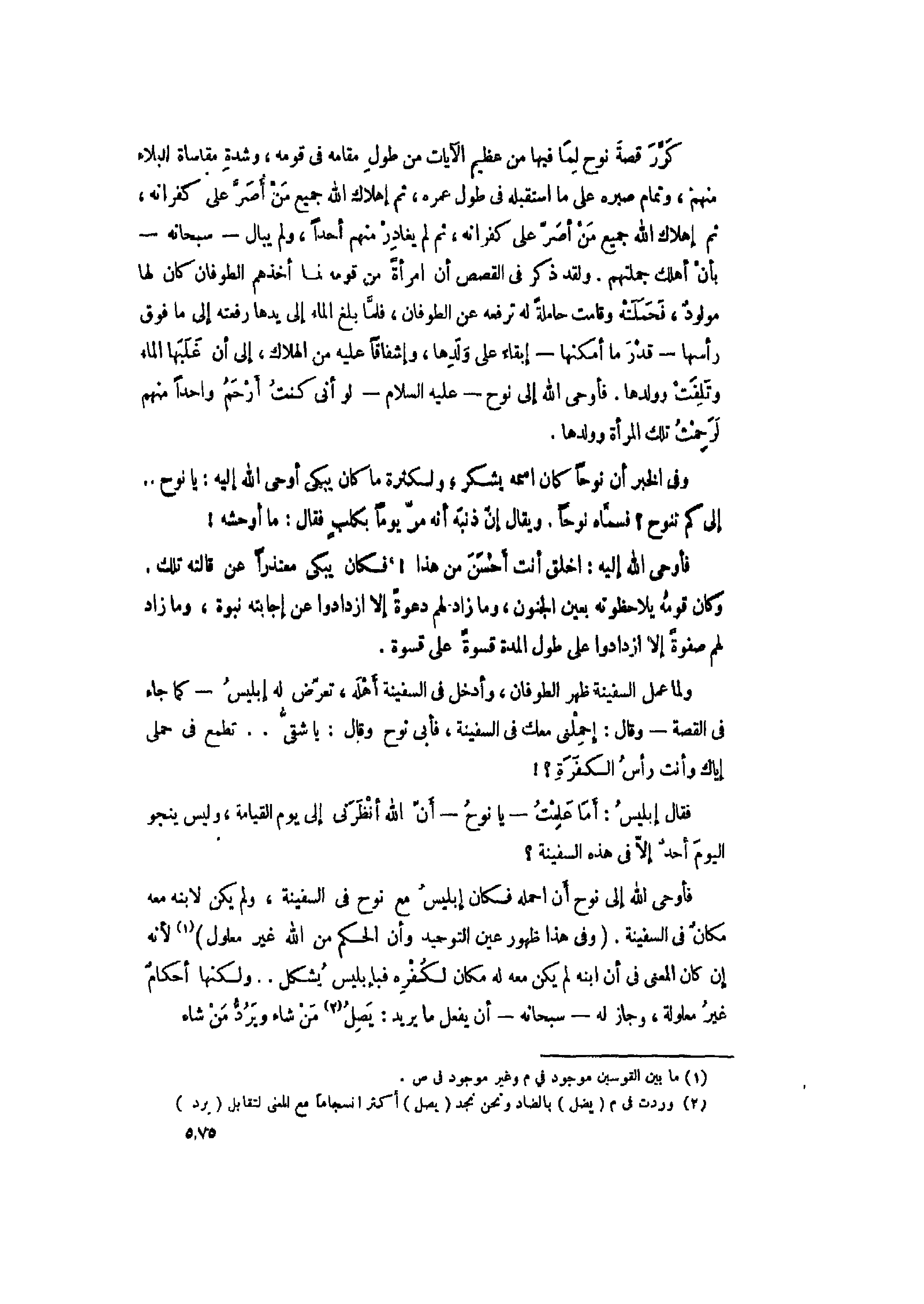 ولما عمل السفينة ظهر الطوفان، وأدخل فى السفينة أهله، تعرّض له إبليس- كما جاء فى القصة- وقال: احملنى معك فى السفينة، فأبى نوح وقال: يا شقّى.. تطمع فى حملى إياك وأنت رأس الكفرة؟! فقال إبليس: أما علمت- يا نوح- أنّ الله أنظرنى إلى يوم القيامة، وليس ينجو اليوم أحد إلّا فى هذه السفينة؟