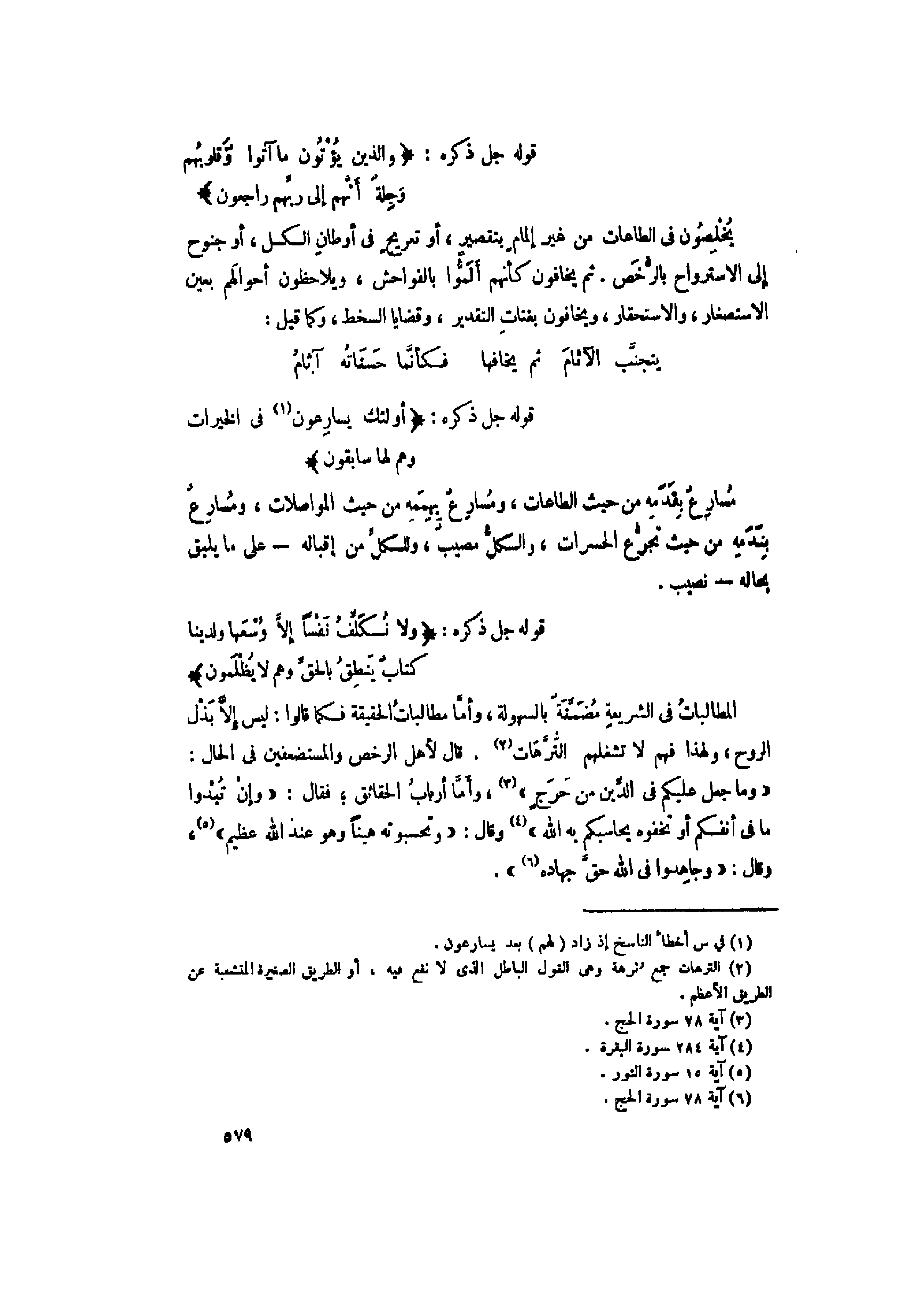 «وَما جَعَلَ عَلَيْكُمْ فِي الدِّينِ مِنْ حَرَجٍ» «3» ، وأمّا أرباب الحقائق فقال: «وَإِنْ تُبْدُوا ما فِي أَنْفُسِكُمْ أَوْ تُخْفُوهُ يُحاسِبْكُمْ بِهِ اللَّهُ» «4» وقال: «وَتَحْسَبُونَهُ هَيِّناً وَهُوَ عِنْدَ اللَّهِ عَظِيمٌ» «5» ، وقال: «وَجاهِدُوا فِي اللَّهِ حَقَّ جِهادِهِ «6» » .
