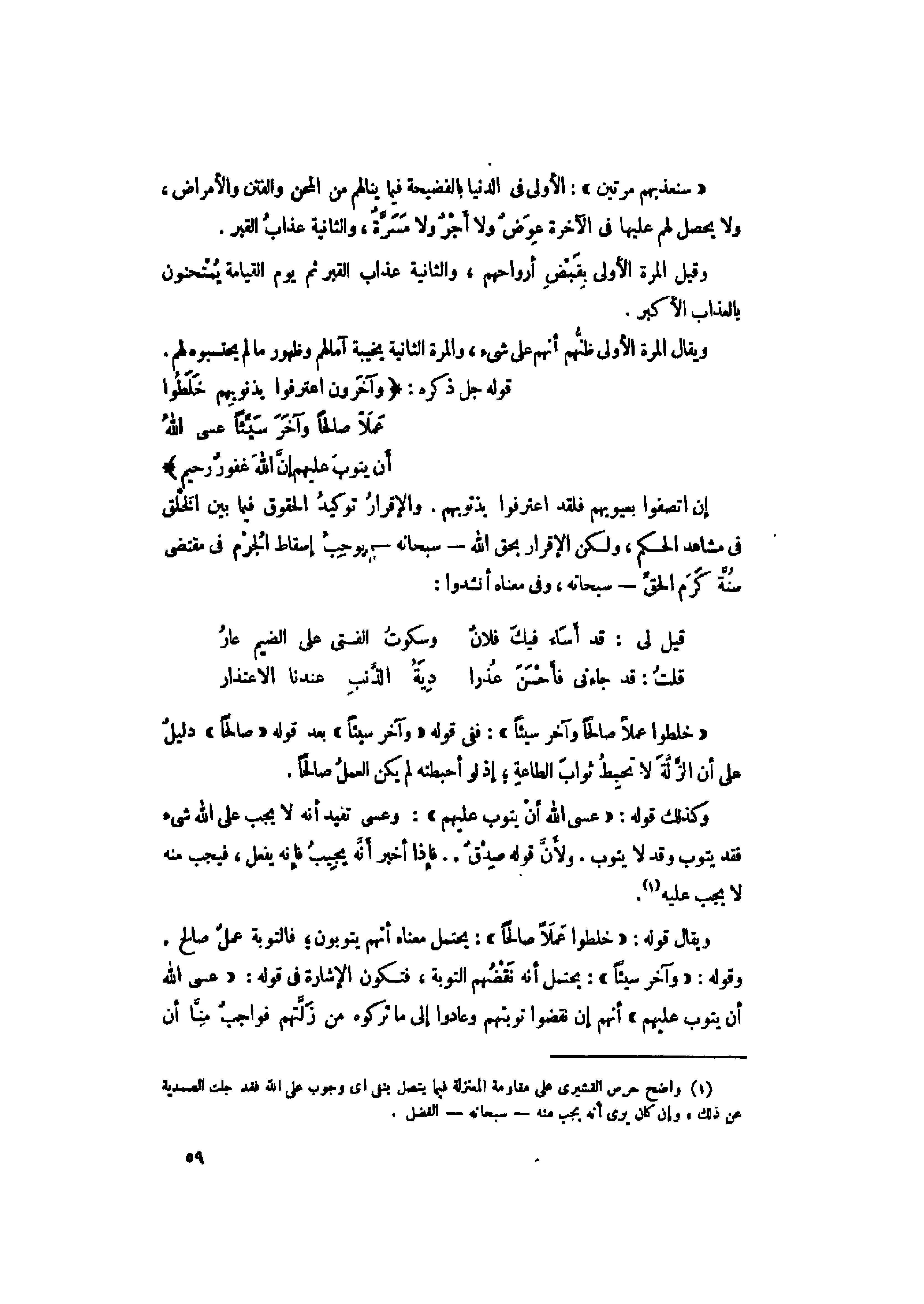 (1) واضح حرص القشيري على مقاومة المعتزلة فيما يتصل بنفي اى وجوب على الله فقد جلت الصمدية عن ذلك، وإن كان يرى أنه يجب منه- سبحانه- الفضل.