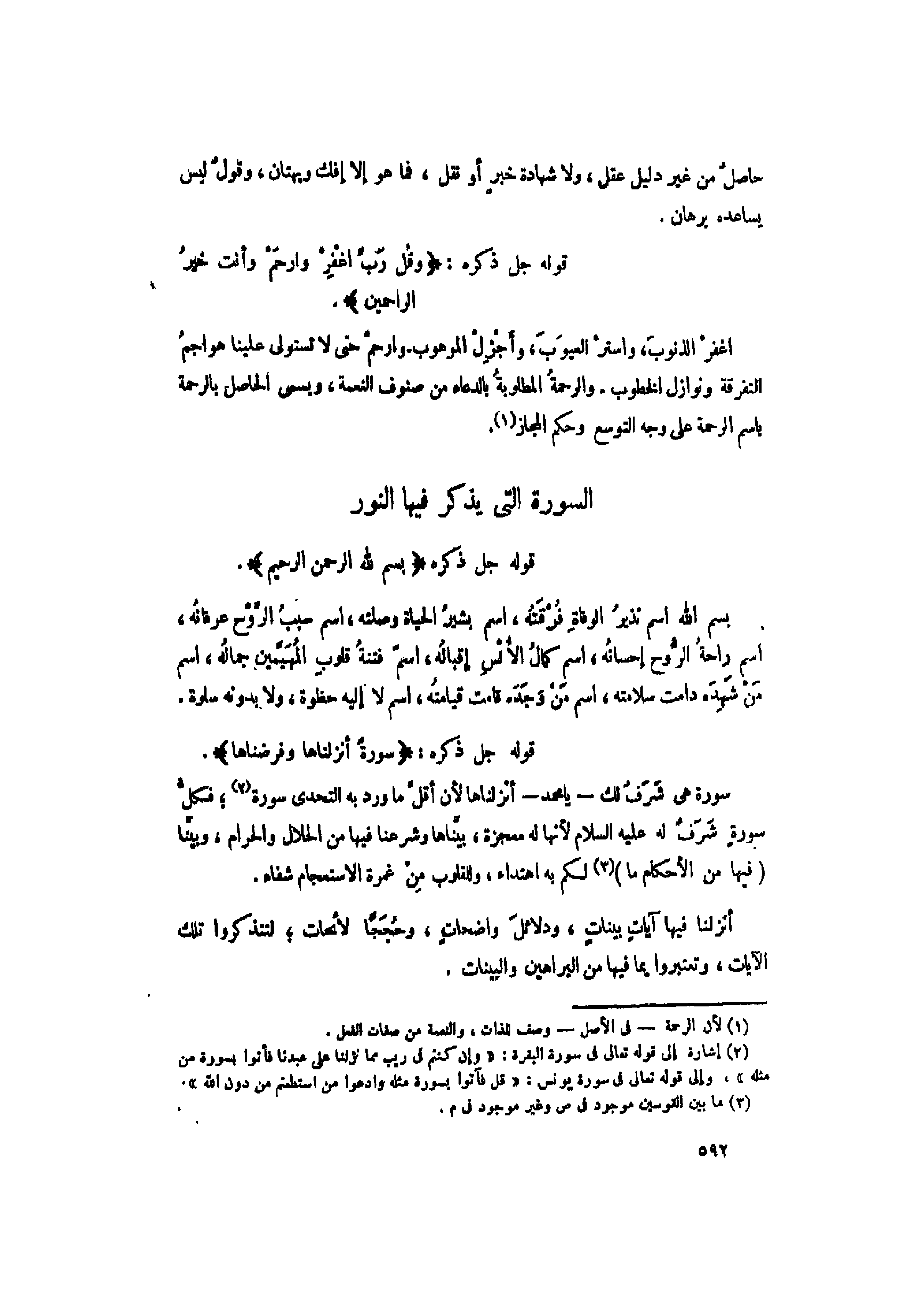 (2) إشارة إلى قوله تعالى فى سورة البقرة: «وَإِنْ كُنْتُمْ فِي رَيْبٍ مِمَّا نَزَّلْنا عَلى عَبْدِنا فَأْتُوا بِسُورَةٍ مِنْ مِثْلِهِ» ، وإلى قوله تعالى فى سورة يونس: «قُلْ فَأْتُوا بِسُورَةٍ مِثْلِهِ وَادْعُوا مَنِ اسْتَطَعْتُمْ مِنْ دُونِ اللَّهِ» .