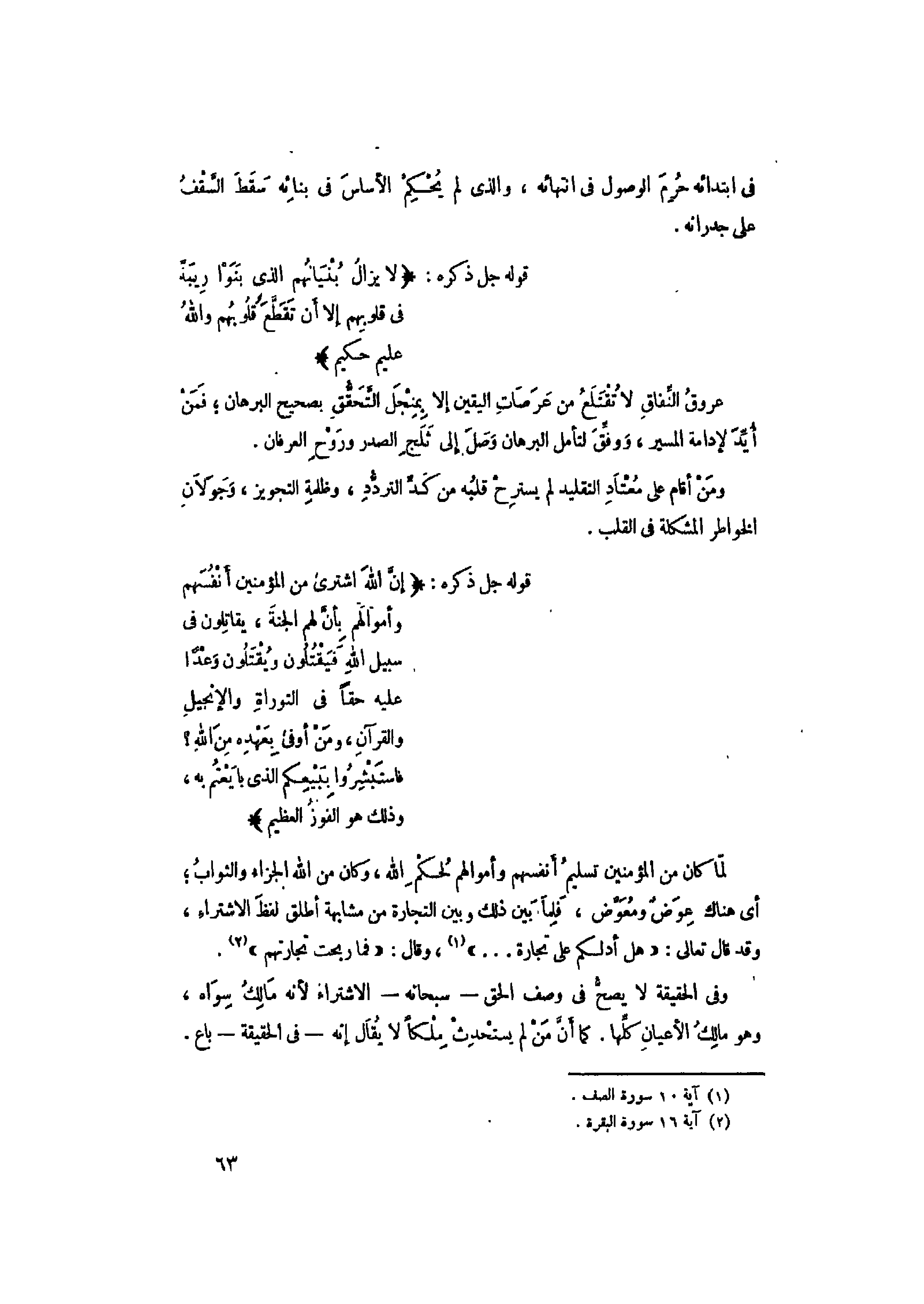 وفى الحقيقة لا يصحّ فى وصف الحق- سبحانه- الاشتراء لأنه مالك سواه، وهو مالك الأعيان كلّها. كما أنّ من لم يستحدث ملكا لا يقال إنه- فى الحقيقة- باع.