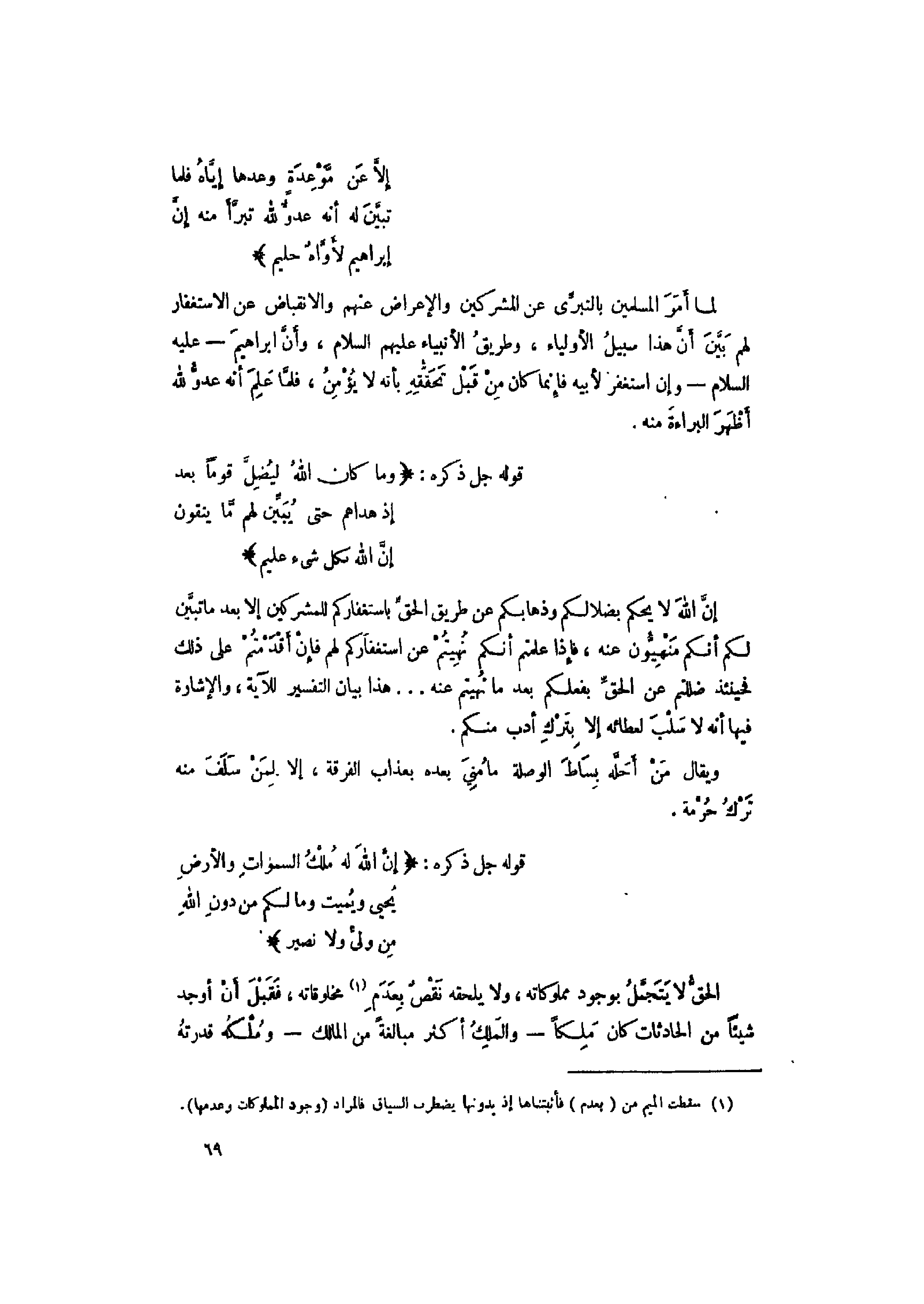 إنّ الله لا يحكم بضلالكم وذهابكم عن طريق الحقّ باستغفاركم للمشركين إلا بعد ما تبيّن لكم أنكم منهيّون عنه، فإذا علمتم أنكم نهيتم عن استغفاركم لهم فإن أقدمتم على ذلك فحينئذ ضللتم عن الحقّ بفعلكم بعد ما نهيتم عنه ... هذا بيان التفسير للآية، والإشارة فيها أنه لا سلب لعطائه إلا بترك أدب منكم.