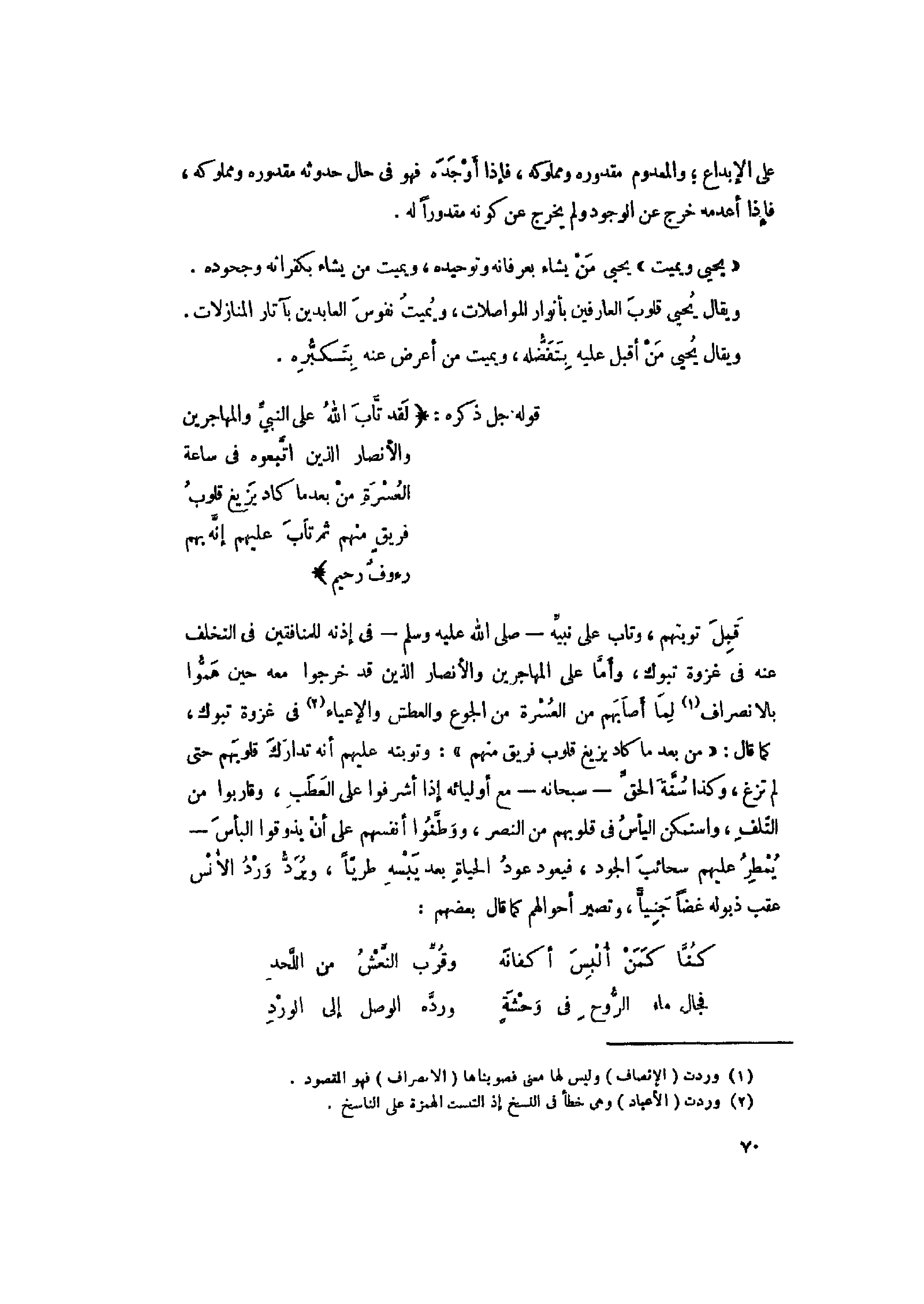 قبل توبتهم، وتاب على نبيّه- صلى الله عليه وسلم- فى إذنه للمنافقين فى التخلف عنه فى غزوة تبوك، وأمّا على المهاجرين والأنصار الذين قد خرجوا معه حين همّوا بالانصراف «1» لما أصابهم من العسرة من الجوع والعطش والإعياء «2» فى غزوة تبوك، كما قال: «مِنْ بَعْدِ ما كادَ يَزِيغُ قُلُوبُ فَرِيقٍ مِنْهُمْ» : وتوبته عليهم أنه تدارك قلوبهم حتى لم تزغ، وكذا سنّة الحقّ- سبحانه- مع أوليائه إذا أشرفوا على العطب، وقاربوا من التّلف، واستمكن اليأس فى قلوبهم من النصر، ووطّنوا أنفسهم على أن يذوقوا البأس- يمطر عليهم سحائب الجود، فيعود عود الحياة بعد يبسه طريّا، ويردّ ورد الأنس عقب ذبوله غضا جنيّا، وتصير أحوالهم كما قال بعضهم: