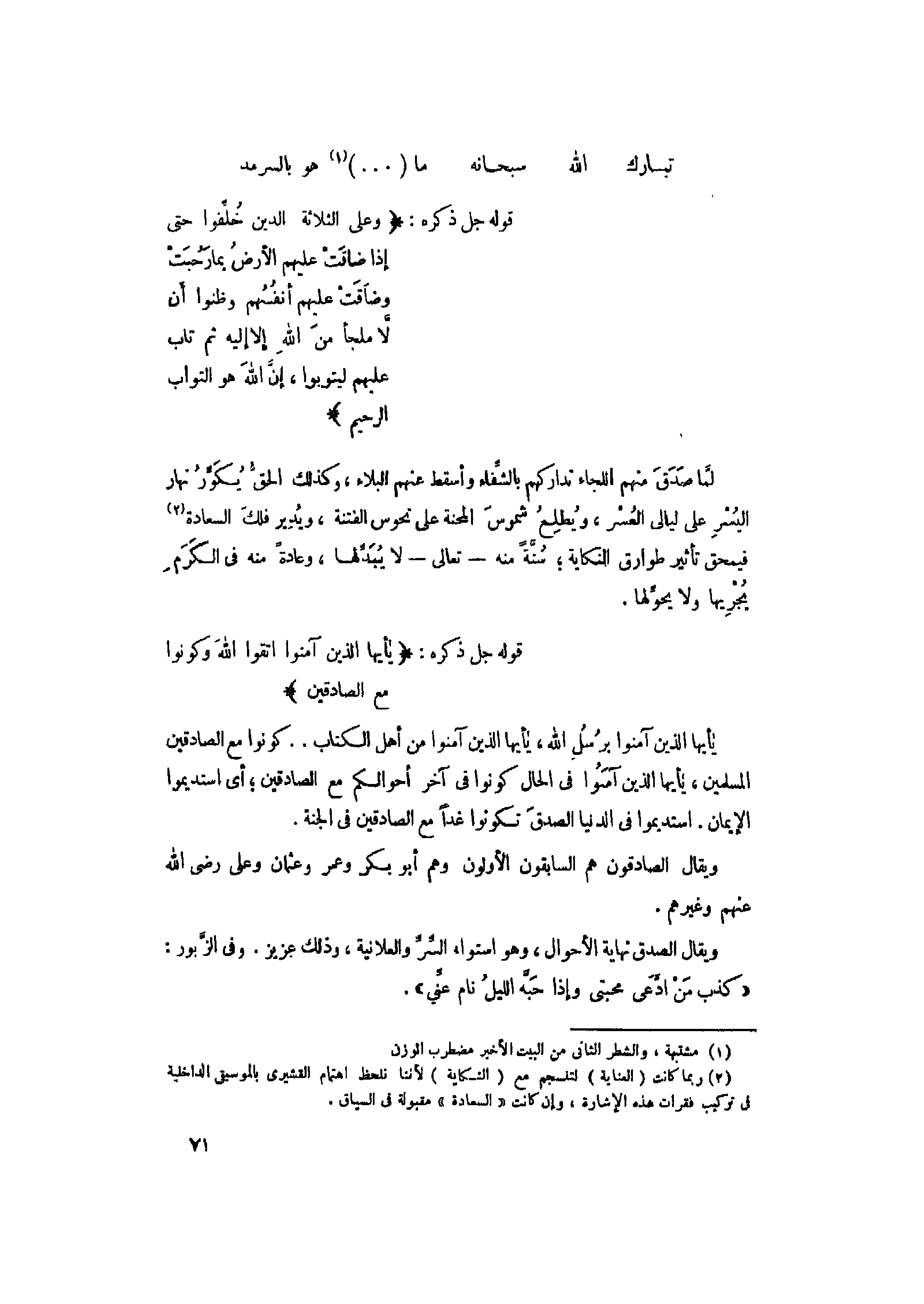(2) ربما كانت (العناية) لتنسجم مع (الشكاية) لأننا نلحظ اهتمام القشيري بالموسيقى الداخلية فى تركيب فقرات هذه الإشارة، وإن كانت «السعادة» مقبولة فى السياق.