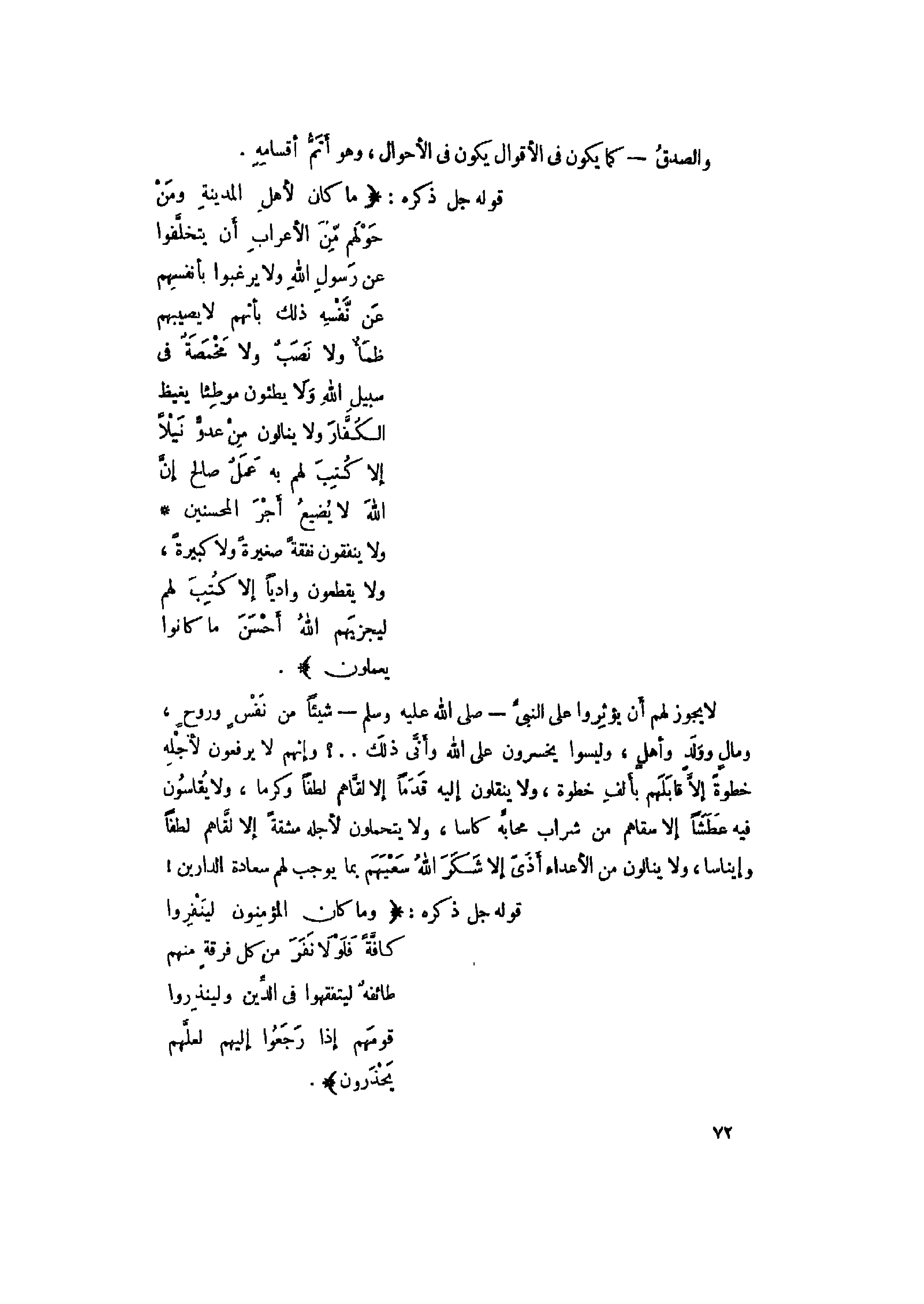 لا يجوز لهم أن يؤثروا على النبىّ- صلى الله عليه وسلم- شيئا من نفس وروح، ومال وولد وأهل، وليسوا يخسرون على الله وأنّى ذلك..؟ وإنهم لا يرفعون لأجله خطوة إلّا قابلهم بألف خطوة، ولا ينقلون إليه قدما إلا لقّاهم لطفا وكرما، ولا يقاسون فيه عطشا إلا سقاهم من شراب محابّه كاسا، ولا يتحملون لأجله مشقة إلا لقّاهم لطفا وإيناسا، ولا ينالون من الأعداء أذىّ إلا شكر الله سعيهم بما يوجب لهم سعادة الدارين! قوله جل ذكره: