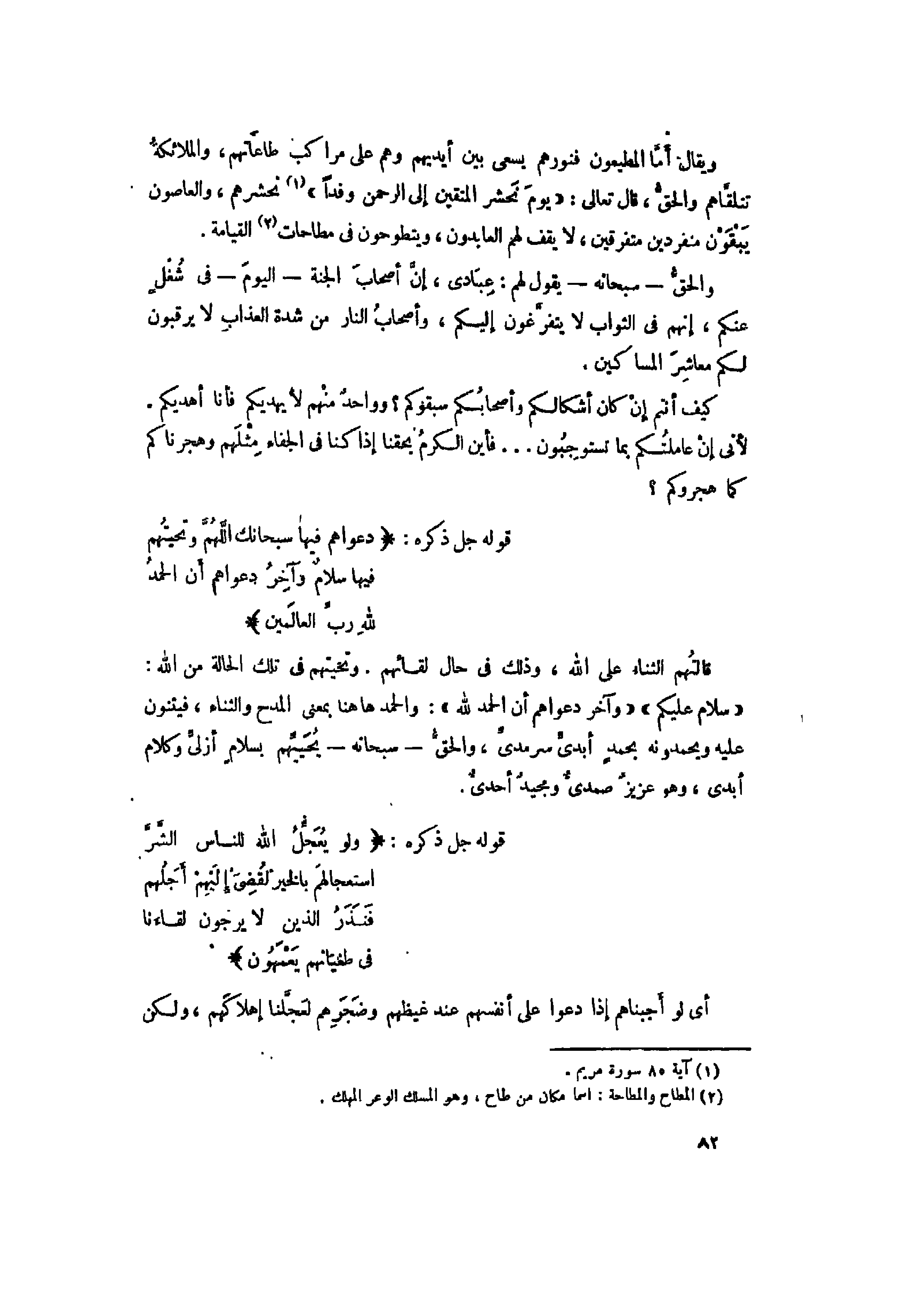 قالتهم الثناء على الله، وذلك فى حال لقائهم. وَتَحِيَّتُهُمْ فى تلك الحالة من الله:
