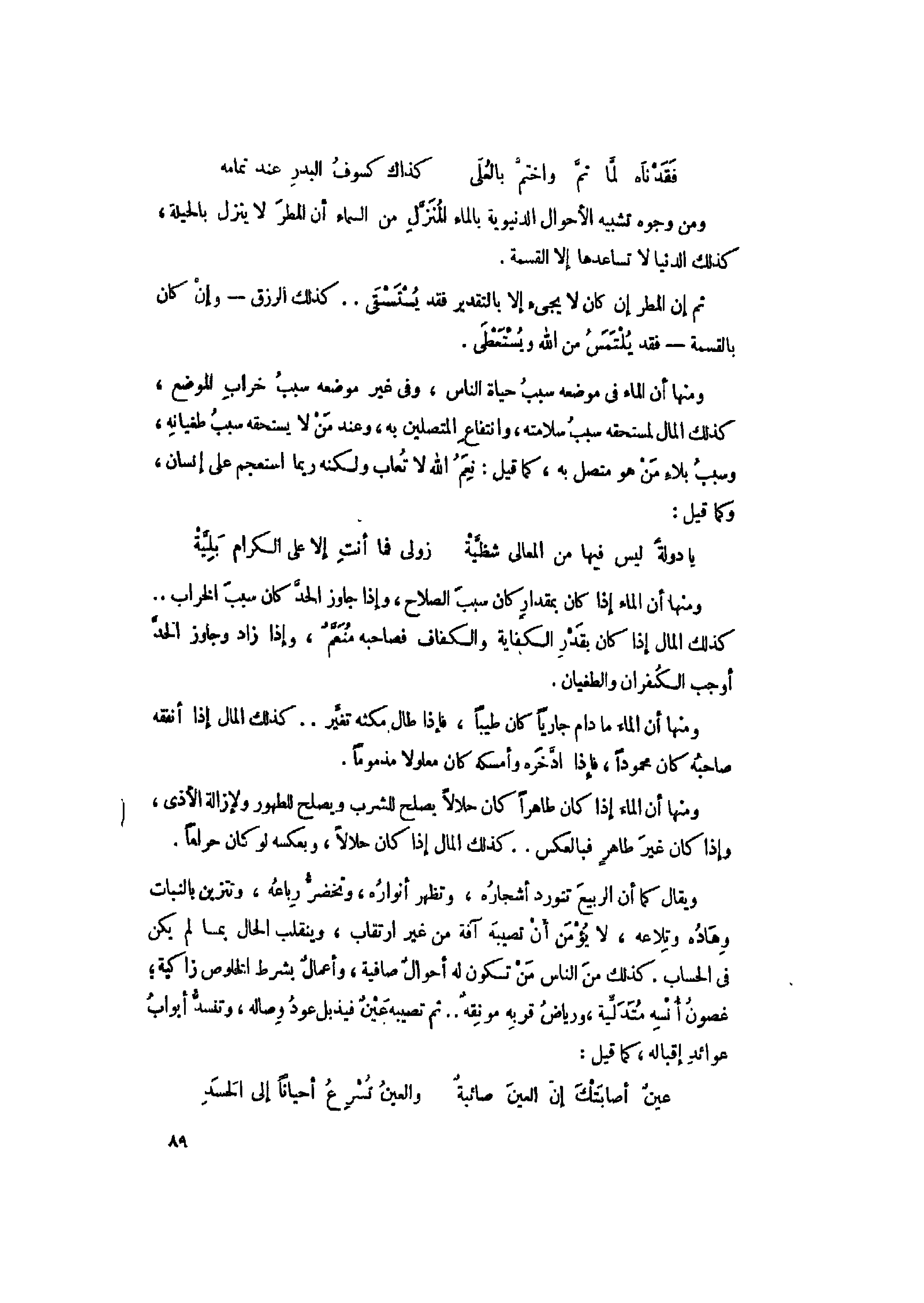 ومنها أن الماء فى موضعه سبب حياة الناس، وفى غير موضعه سبب خراب الموضع، كذلك المال لمستحقه سبب سلامته، وانتفاع المتصلين به، وعند من لا يستحقه سبب طغيانه، وسبب بلاء من هو متصل به، كما قيل: نعم الله لا تعاب ولكنه ربما استعجم على إنسان، وكما قيل: