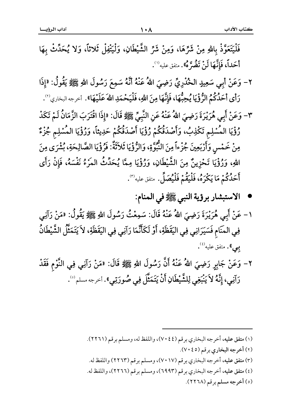 1 - عَنْ أَبِي هُرَيْرَةَ رَضِيَ اللهُ عَنْهُ قَالَ: سَمِعْتُ رَسُولَ اللهِ - صلى الله عليه وسلم - يَقُولُ: «مَنْ رَآنِي فِي المَنَامِ فَسَيَرَانِي فِي اليَقَظَةِ، أَوْ لَكَأَنَّمَا رَآنِي فِي اليَقَظَةِ، لاَ يَتَمَثَّلُ الشَّيْطَانُ بِي». متفق عليه (¬4).