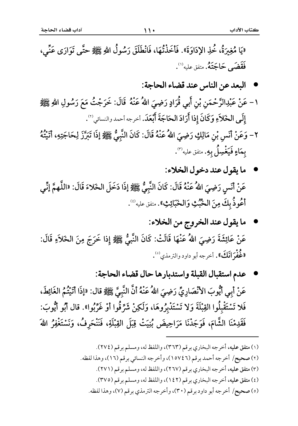1 - عَنْ عَبْدِالرَّحْمَنِ بْنِ أَبي قُرَادٍ رَضِيَ اللهُ عَنْهُ قَالَ: خَرَجْتُ مَعَ رَسُولِ اللهِ - صلى الله عليه وسلم - إِلَى الخَلاَءِ وَكَانَ إِذا أَرَادَ الحَاجَةَ أَبْعَدَ. أخرجه أحمد والنسائي (¬2).