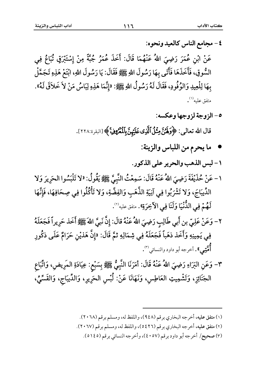 1 - عَنْ حُذَيْفَةَ رَضِيَ اللهُ عَنْهُ قَالَ: سَمِعْتُ النَّبِيَّ - صلى الله عليه وسلم - يَقُولُ: «لا تَلْبَسُوا الحَرِيرَ وَلا الدِّيبَاجَ، وَلا تَشْرَبُوا فِي آنِيَةِ الذَّهَبِ وَالفِضَّةِ، وَلا تَأْكُلُوا فِي صِحَافِهَا، فَإِنَّهَا لَهُمْ فِي الدُّنْيَا وَلَنَا فِي الآخِرَةِ». متفق عليه (¬2).