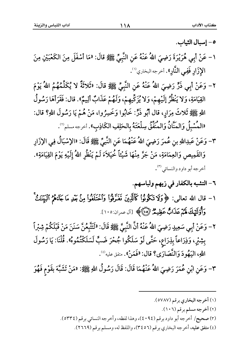 1 - عَنْ أبِي هُرَيْرَةَ رَضِيَ اللهُ عَنْهُ عَنِ النَّبِيِّ - صلى الله عليه وسلم - قالَ: «مَا أسْفَلَ مِنَ الكَعْبَيْنِ مِنَ الإِزَارِ فَفِي النَّارِ». أخرجه البخاري (¬1).