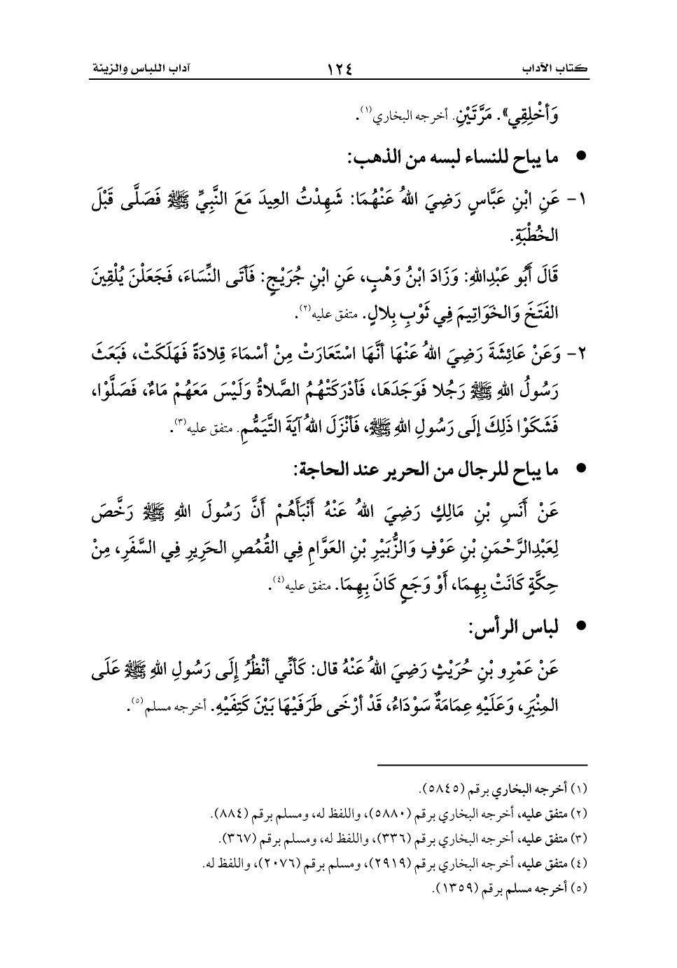 عَنْ أَنَسِ بْنِ مَالِكٍ رَضِيَ اللهُ عَنْهُ أَنْبَأَهُمْ أَنَّ رَسُولَ اللهِ - صلى الله عليه وسلم - رَخَّصَ لِعَبْدِالرَّحْمَنِ بْنِ عَوْفٍ وَالزُّبَيْرِ بْنِ العَوَّامِ فِي القُمُصِ الحَرِيرِ فِي السَّفَرِ، مِنْ حِكَّةٍ كَانَتْ بِهِمَا، أَوْ وَجَعٍ كَانَ بِهِمَا. متفق عليه (¬4).