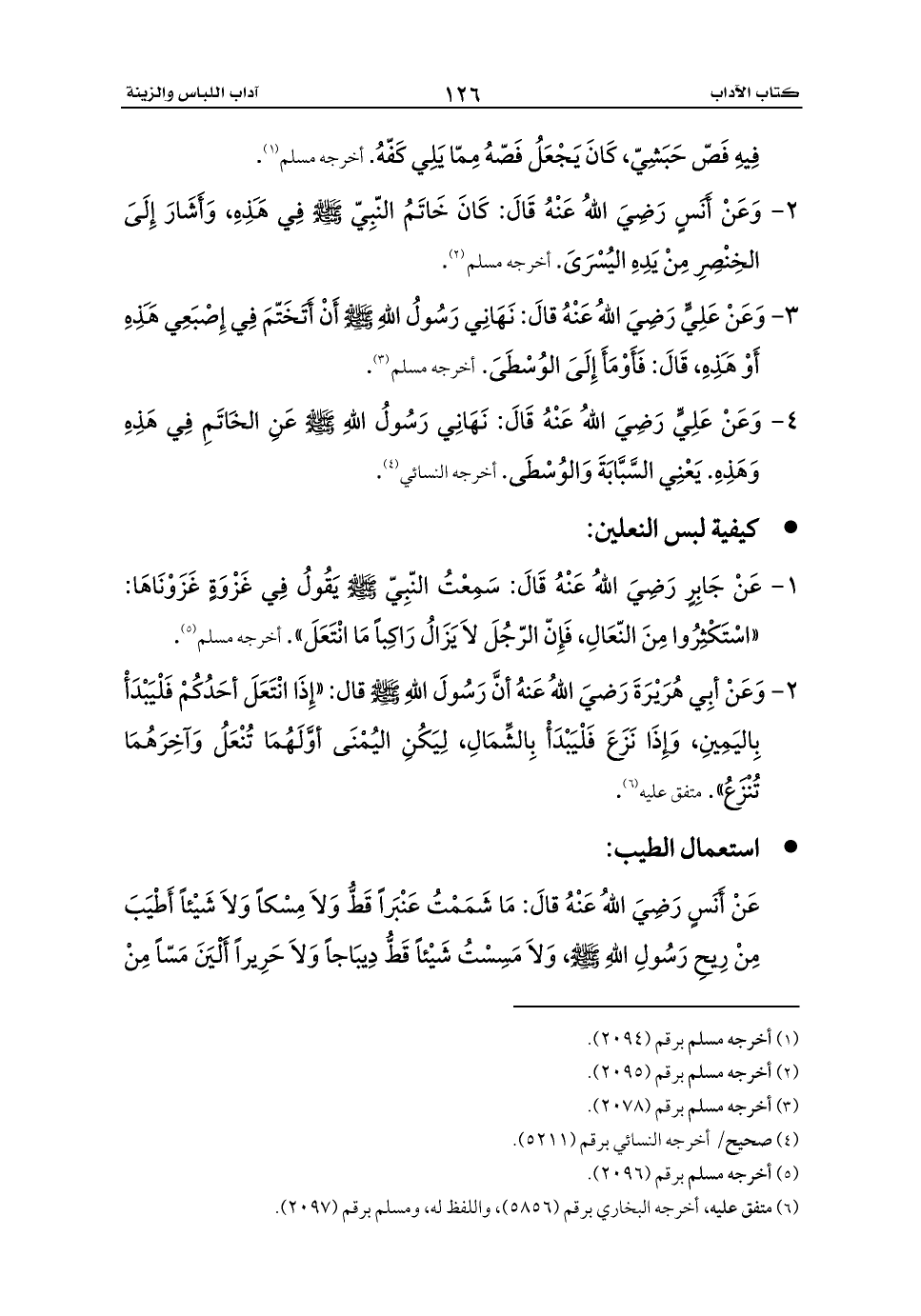 عَنْ أَنَسٍ رَضِيَ اللهُ عَنْهُ قالَ: مَا شَمَمْتُ عَنْبَراً قَطُّ وَلاَ مِسْكاً وَلاَ شَيْئاً أَطْيَبَ مِنْ رِيحِ رَسُولِ اللهِ - صلى الله عليه وسلم -، وَلاَ مَسِسْتُ شَيْئاً قَطُّ دِيبَاجاً وَلاَ حَرِيراً أَلْيَنَ مَسّاً مِنْ