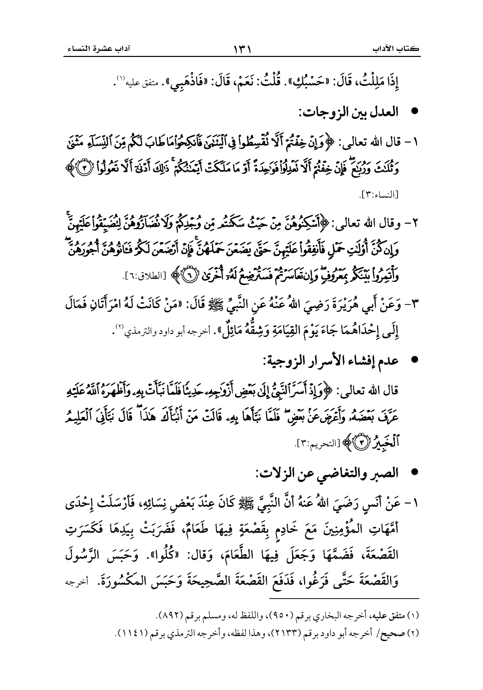 1 - عَنْ أنَسٍ رَضَيَ اللهُ عَنهُ أنَّ النَّبِيَّ - صلى الله عليه وسلم - كَانَ عِنْدَ بَعْضِ نِسَائِهِ، فَأرْسَلَتْ إِحْدَى أمَّهَاتِ المُؤْمِنِينَ مَعَ خَادِمٍ بِقَصْعَةٍ فِيهَا طَعَامٌ، فَضَرَبَتْ بِيَدِهَا فَكَسَرَتِ القَصْعَةَ، فَضَمَّهَا وَجَعَلَ فِيهَا الطَّعَامَ، وَقال: «كُلُوا». وَحَبَسَ الرَّسُولَ