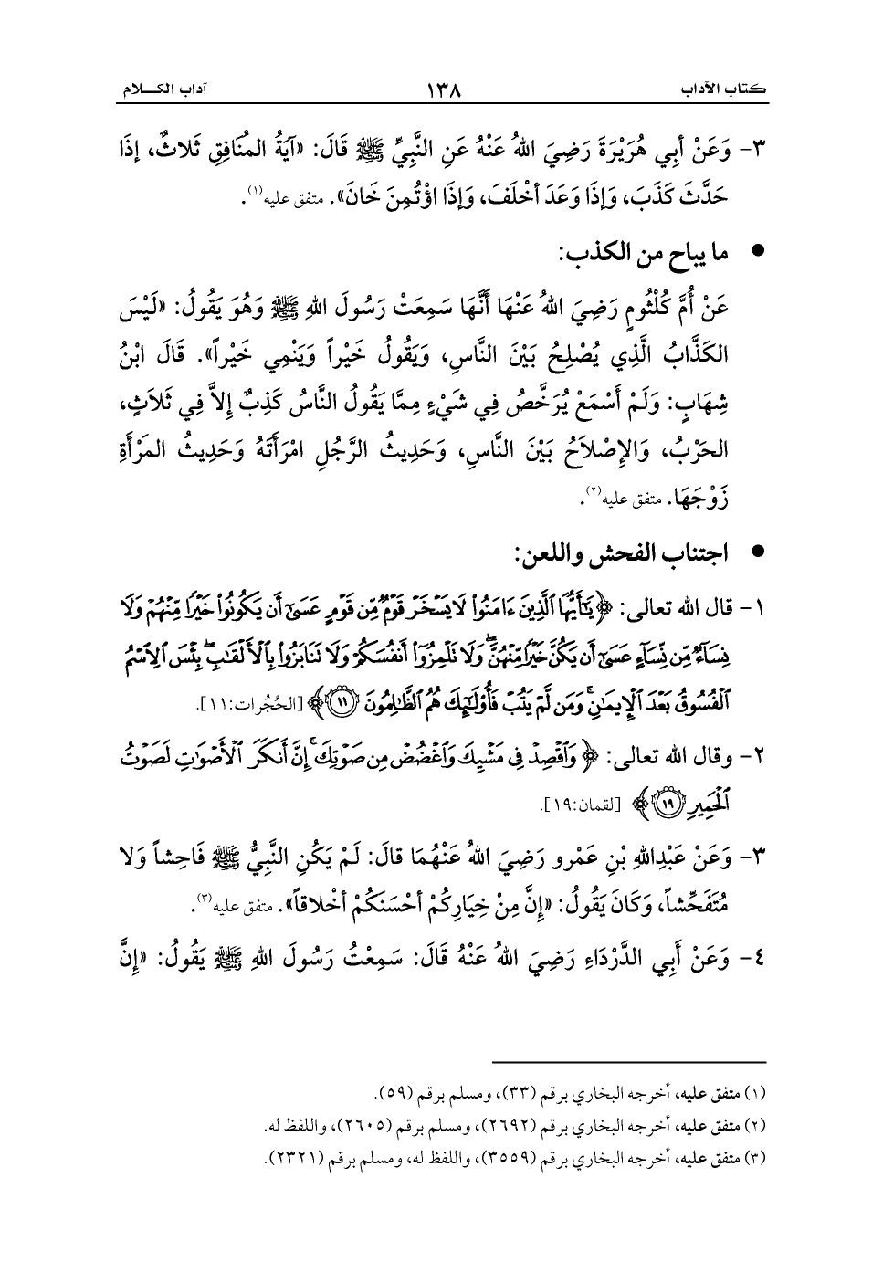 3 - وَعَنْ أبِي هُرَيْرَةَ رَضِيَ اللهُ عَنْهُ عَنِ النَّبِيِّ - صلى الله عليه وسلم - قَالَ: «آيَةُ المُنَافِقِ ثَلاثٌ، إذَا حَدَّثَ كَذَبَ، وَإذَا وَعَدَ أخْلَفَ، وَإذَا اؤْتُمِنَ خَانَ». متفق عليه (¬1).