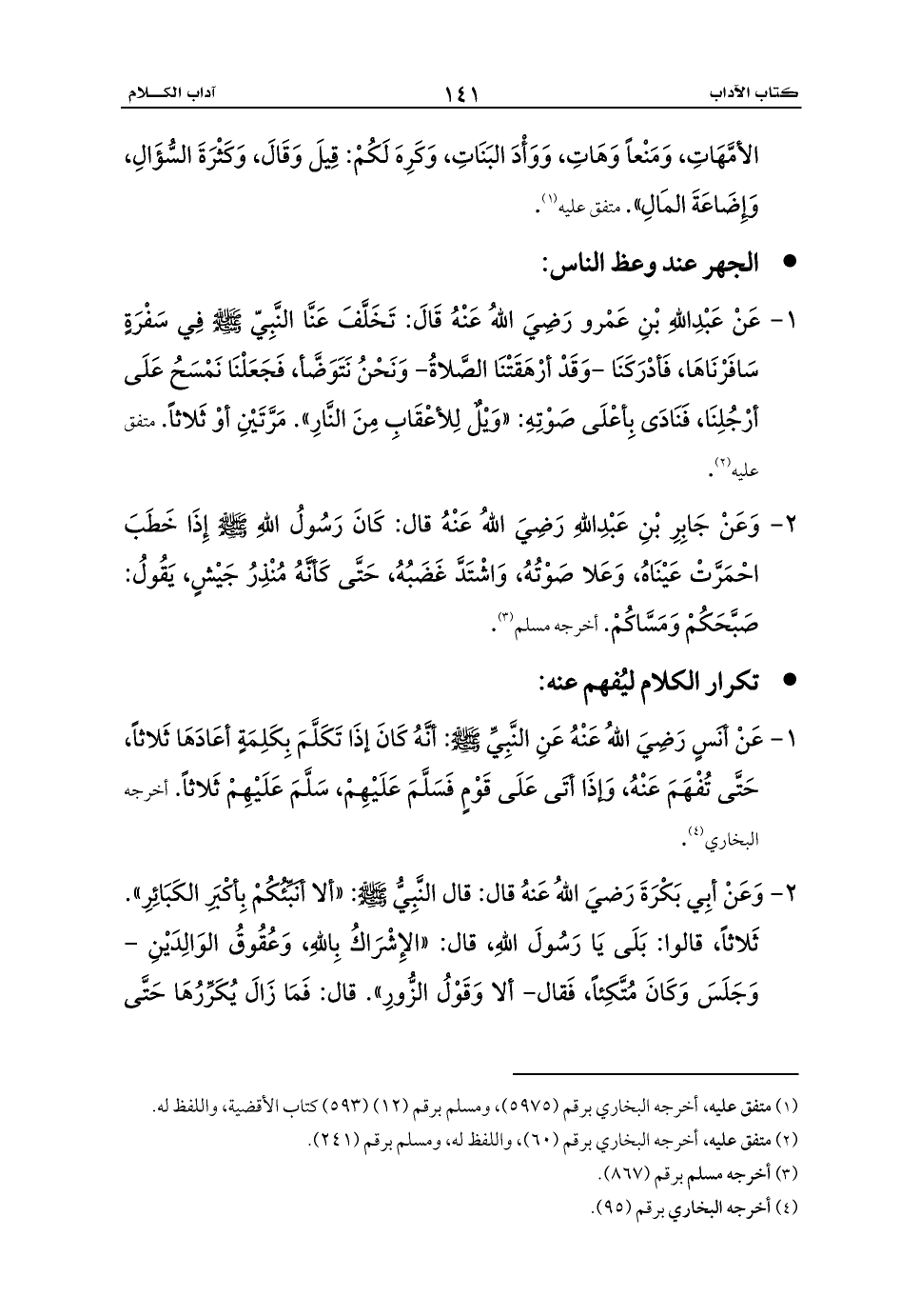 1 - عَنْ أنَسٍ رَضِيَ اللهُ عَنْهُ عَنِ النَّبِيِّ - صلى الله عليه وسلم -: أنَّهُ كَانَ إذَا تَكَلَّمَ بِكَلِمَةٍ أعَادَهَا ثَلاثاً، حَتَّى تُفْهَمَ عَنْهُ، وَإذَا أتَى عَلَى قَوْمٍ فَسَلَّمَ عَلَيْهِمْ، سَلَّمَ عَلَيْهِمْ ثَلاثاً. أخرجه البخاري (¬4).
