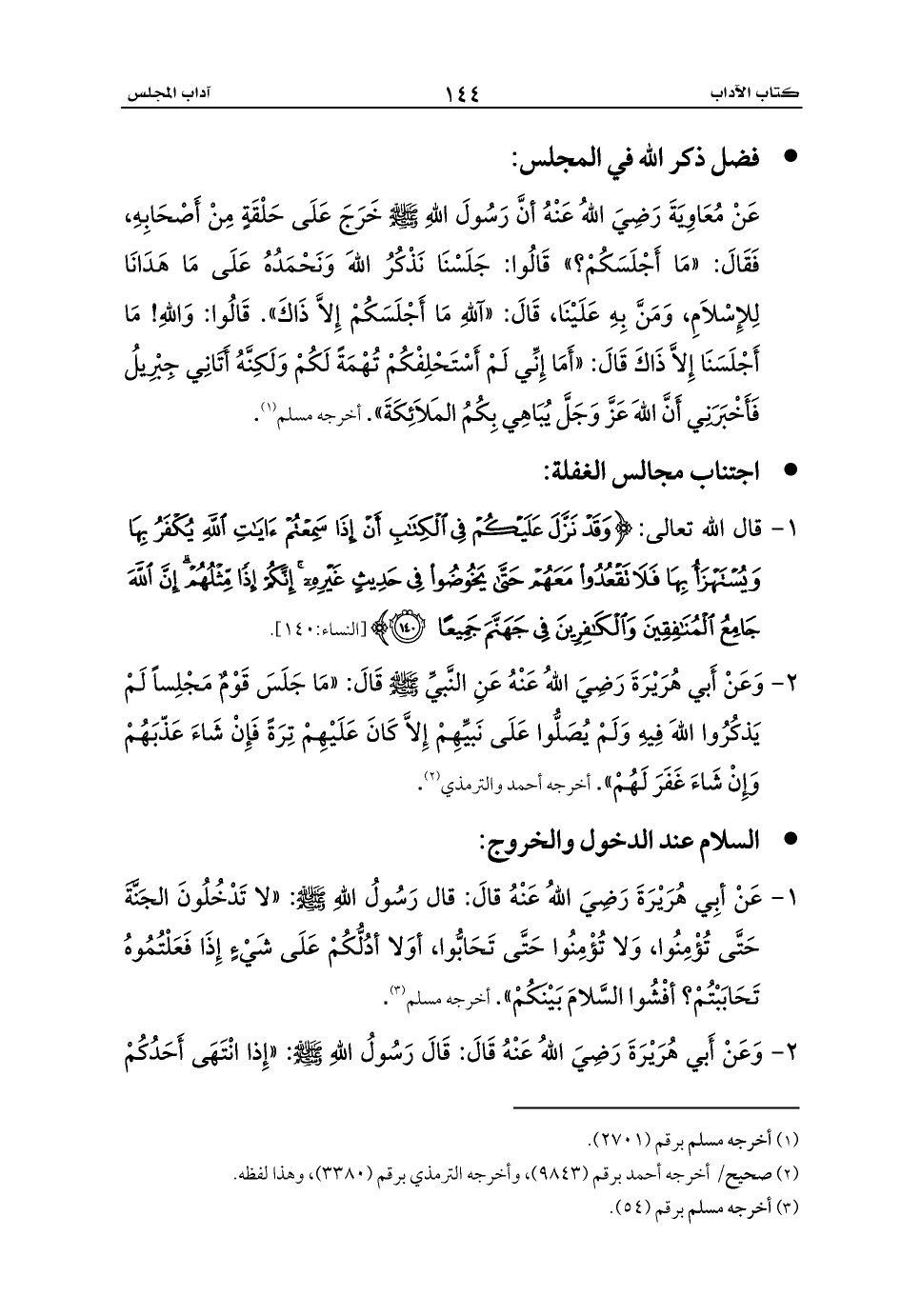 عَنْ مُعَاوِيَةَ رَضِيَ اللهُ عَنْهُ أنَّ رَسُولَ اللهِ - صلى الله عليه وسلم - خَرَجَ عَلَى حَلْقَةٍ مِنْ أَصْحَابِهِ، فَقَالَ: «مَا أَجْلَسَكُمْ؟» قَالُوا: جَلَسْنَا نَذْكُرُ اللهَ وَنَحْمَدُهُ عَلَى مَا هَدَانَا لِلإِسْلاَمِ، وَمَنَّ بِهِ عَلَيْنَا، قَالَ: «آللهِ مَا أَجْلَسَكُمْ إِلاَّ ذَاكَ». قَالُوا: وَاللهِ! مَا أَجْلَسَنَا إِلاَّ ذَاكَ قَالَ: «أَمَا إِنِّي لَمْ أَسْتَحْلِفْكُمْ تُهْمَةً لَكُمْ وَلَكِنَّهُ أَتَانِي جِبْرِيلُ فَأَخْبَرَنِي أَنَّ اللهَ عَزَّ وَجَلَّ يُبَاهِي بِكُمُ المَلاَئِكَةَ». أخرجه مسلم (¬1).