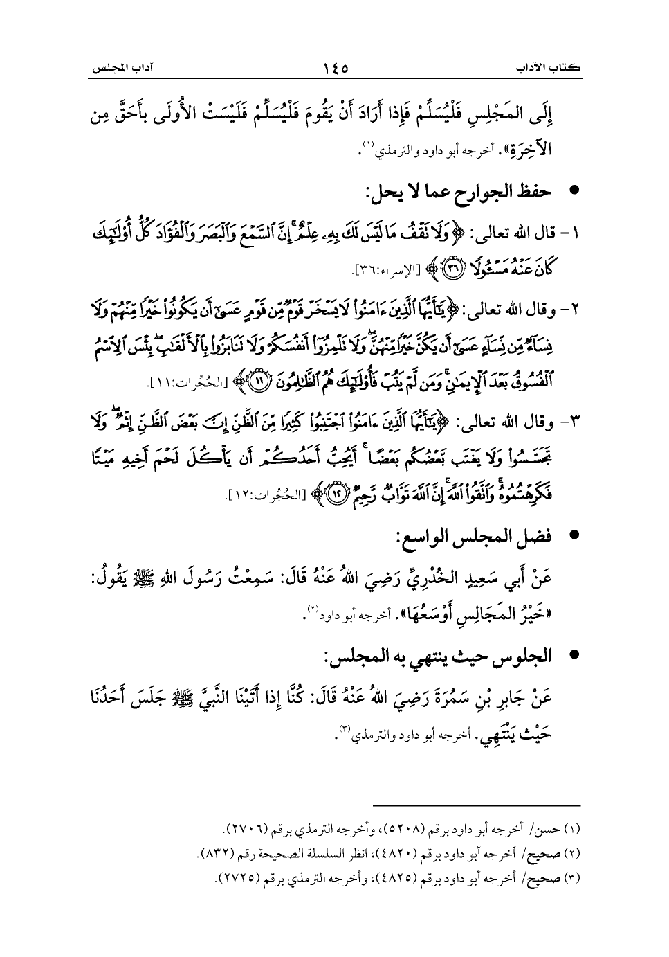 عَنْ أَبي سَعِيدٍ الخُدْرِيِّ رَضِيَ اللهُ عَنْهُ قَالَ: سَمِعْتُ رَسُولَ اللهِ - صلى الله عليه وسلم - يَقُولُ: «خَيْرُ المَجَالِسِ أَوْسَعُهَا». أخرجه أبو داود (¬2).