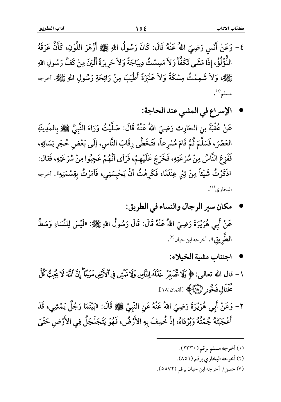 1 - قال الله تعالى: {وَلَا تُصَعِّرْ خَدَّكَ لِلنَّاسِ وَلَا تَمْشِ فِي الْأَرْضِ مَرَحًا إِنَّ اللَّهَ لَا يُحِبُّ كُلَّ مُخْتَالٍ فَخُورٍ (18)} [لقمان:18].