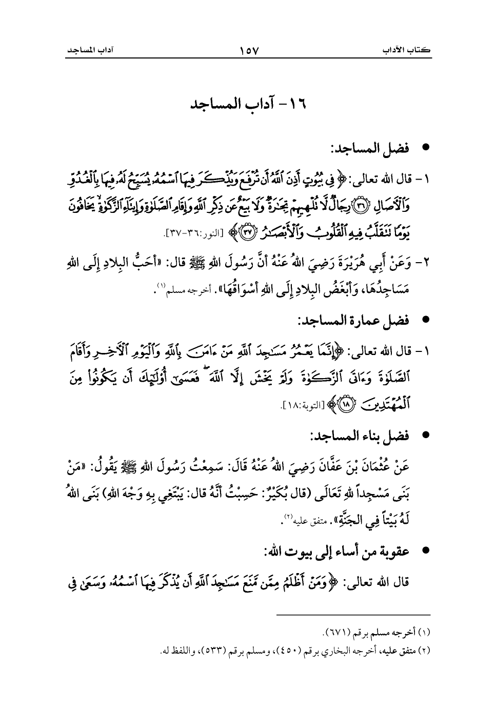 عَنْ عُثْمَانَ بْنَ عَفَّانَ رَضِيَ اللهُ عَنْهُ قَالَ: سَمِعْتُ رَسُولَ اللهِ - صلى الله عليه وسلم - يَقُولُ: «مَنْ بَنَى مَسْجِداً للهِ تَعَالَى (قال بُكَيْرٌ: حَسِبْتُ أنَّهُ قال: يَبْتَغِي بِهِ وَجْهَ اللهِ) بَنَى اللهُ لَهُ بَيْتاً فِي الجَنَّةِ». متفق عليه (¬2).