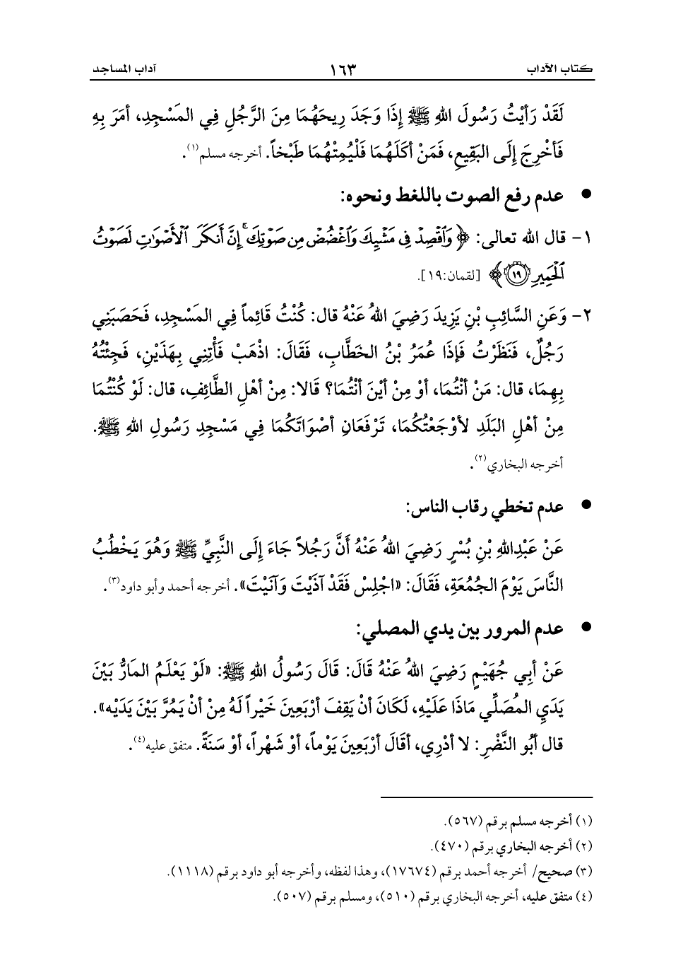 2 - وَعَنِ السَّائِبِ بْنِ يَزِيدَ رَضِيَ اللهُ عَنْهُ قال: كُنْتُ قَائِماً فِي المَسْجِدِ، فَحَصَبَنِي رَجُلٌ، فَنَظَرْتُ فَإذَا عُمَرُ بْنُ الخَطَّابِ، فَقَالَ: اذْهَبْ فَأْتِنِي بِهَذَيْنِ، فَجِئْتُهُ بِهِمَا، قال: مَنْ أنْتُمَا، أوْ مِنْ أيْنَ أنْتُمَا؟ قَالا: مِنْ أهْلِ الطَّائِفِ، قال: لَوْ كُنْتُمَا مِنْ أهْلِ البَلَدِ لأوْجَعْتُكُمَا، تَرْفَعَانِ أصْوَاتَكُمَا فِي مَسْجِدِ رَسُولِ اللهِ - صلى الله عليه وسلم -. أخرجه البخاري (¬2).