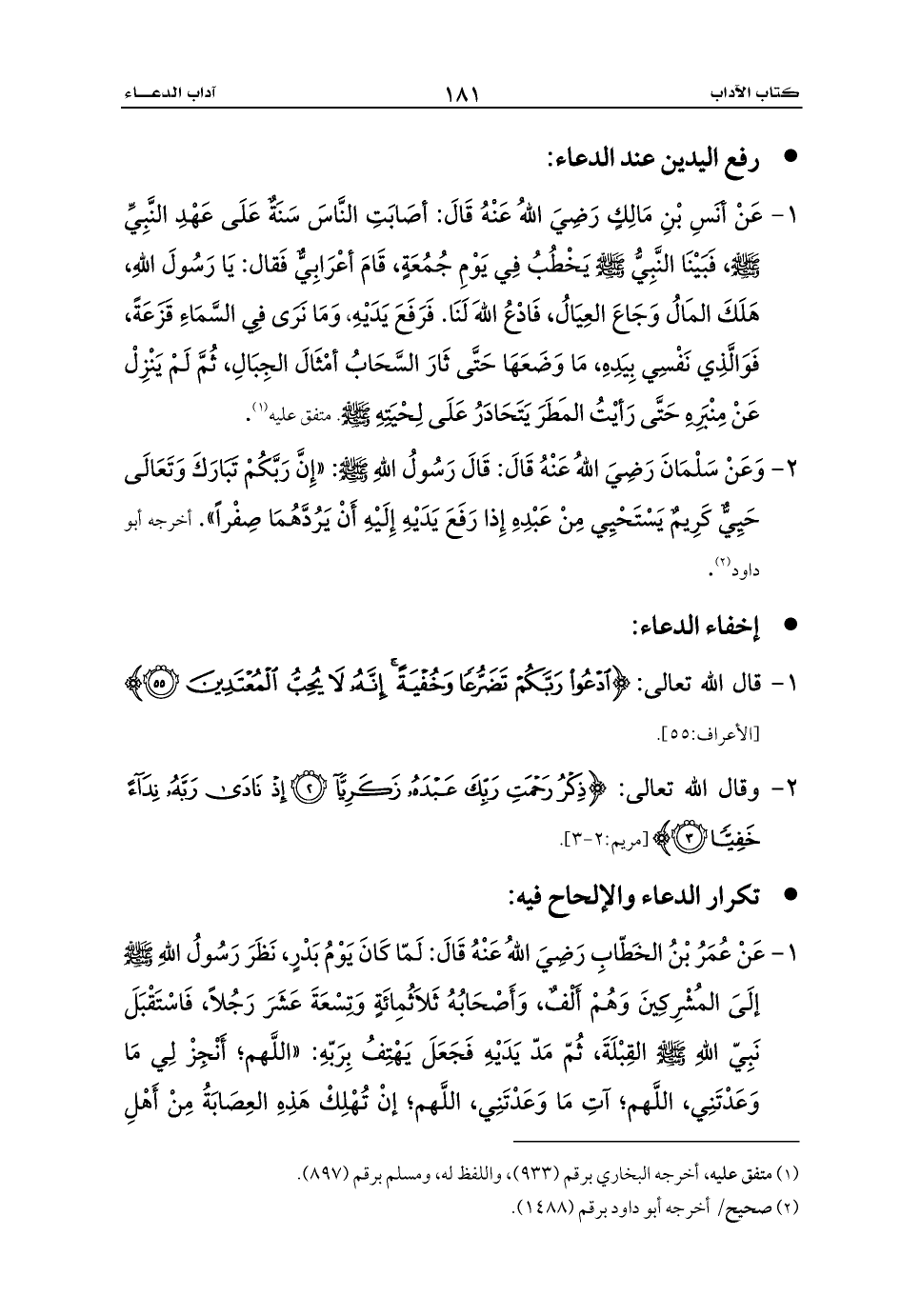 2 - وَعَنْ سَلْمَانَ رَضِيَ اللهُ عَنْهُ قَالَ: قَالَ رَسُولُ اللهِ - صلى الله عليه وسلم -: «إِنَّ رَبَّكُمْ تَبَارَكَ وَتَعَالَى حَيِيٌّ كَرِيمٌ يَسْتَحْيِي مِنْ عَبْدِهِ إِذا رَفَعَ يَدَيْهِ إِلَيْهِ أَنْ يَرُدَّهُمَا صِفْراً». أخرجه أبو داود (¬2).