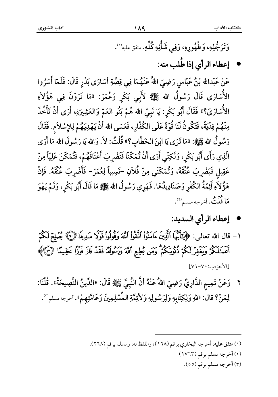 عَنْ عَبْدالله بْنُ عَبّاسٍ رَضِيَ اللهُ عَنْهُمَا فِي قِصَّةِ أسَارَى بَدْرٍ قَالَ: فَلَمّا أَسَرُوا الأُسَارَى قَالَ رَسُولُ الله - صلى الله عليه وسلم - لأَبِي بَكْرٍ وَعُمَرَ: «مَا تَرَوْنَ فِي هَؤُلاَءِ الأُسَارَىَ؟» فَقَالَ أَبُو بَكْرٍ: يَا نَبِيّ الله هُمْ بَنُو العَمّ وَالعَشِيرَةِ، أَرَى أَنْ تَأْخُذَ مِنْهُمْ فِدْيَةً، فَتَكُونُ لَنَا قُوّةً عَلَى الكُفّارِ، فَعَسَى الله أَنْ يَهْدِيَهُمْ لِلإِسْلاَمِ. فَقَالَ رَسُولُ الله - صلى الله عليه وسلم -: «مَا تَرَى يَا ابْنَ الخَطّابِ؟» قُلْتُ: لاَ. وَالله يَا رَسُولَ الله مَا أَرَى الّذِي رَأَى أَبُو بَكْرٍ، وَلَكِنّي أَرَى أَنْ تُمَكّنّا فَنَضْرِبَ أَعْنَاقَهُمْ، فَتُمَكّنَ عَلِيّاً مِنْ عَقِيلٍ فَيَضْرِبَ عُنُقَهُ، وَتُمَكّنّي مِنْ فُلاَنٍ -نَسِيباً لِعُمَرَ- فَأَضْرِبَ عُنُقَهُ. فَإنّ هَؤُلاَءِ أَئِمّةُ الكُفْرِ وَصَنَادِيدُهَا. فَهَوِي رَسُولُ الله - صلى الله عليه وسلم - مَا قَالَ أَبُو بَكْرٍ، وَلَمْ يَهْوَ مَا قُلْتُ. أخرجه مسلم (¬2).