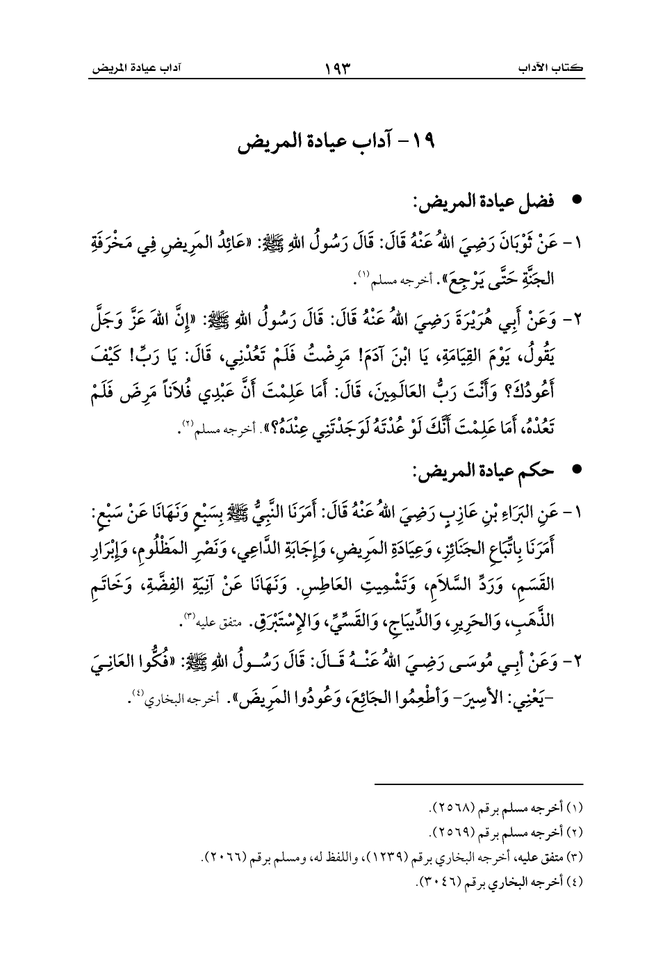 1 - عَنْ ثَوْبَانَ رَضِيَ اللهُ عَنْهُ قَالَ: قَالَ رَسُولُ اللهِ - صلى الله عليه وسلم -: «عَائِدُ المَرِيضِ فِي مَخْرَفَةِ الجَنَّةِ حَتَّى يَرْجِعَ». أخرجه مسلم (¬1).