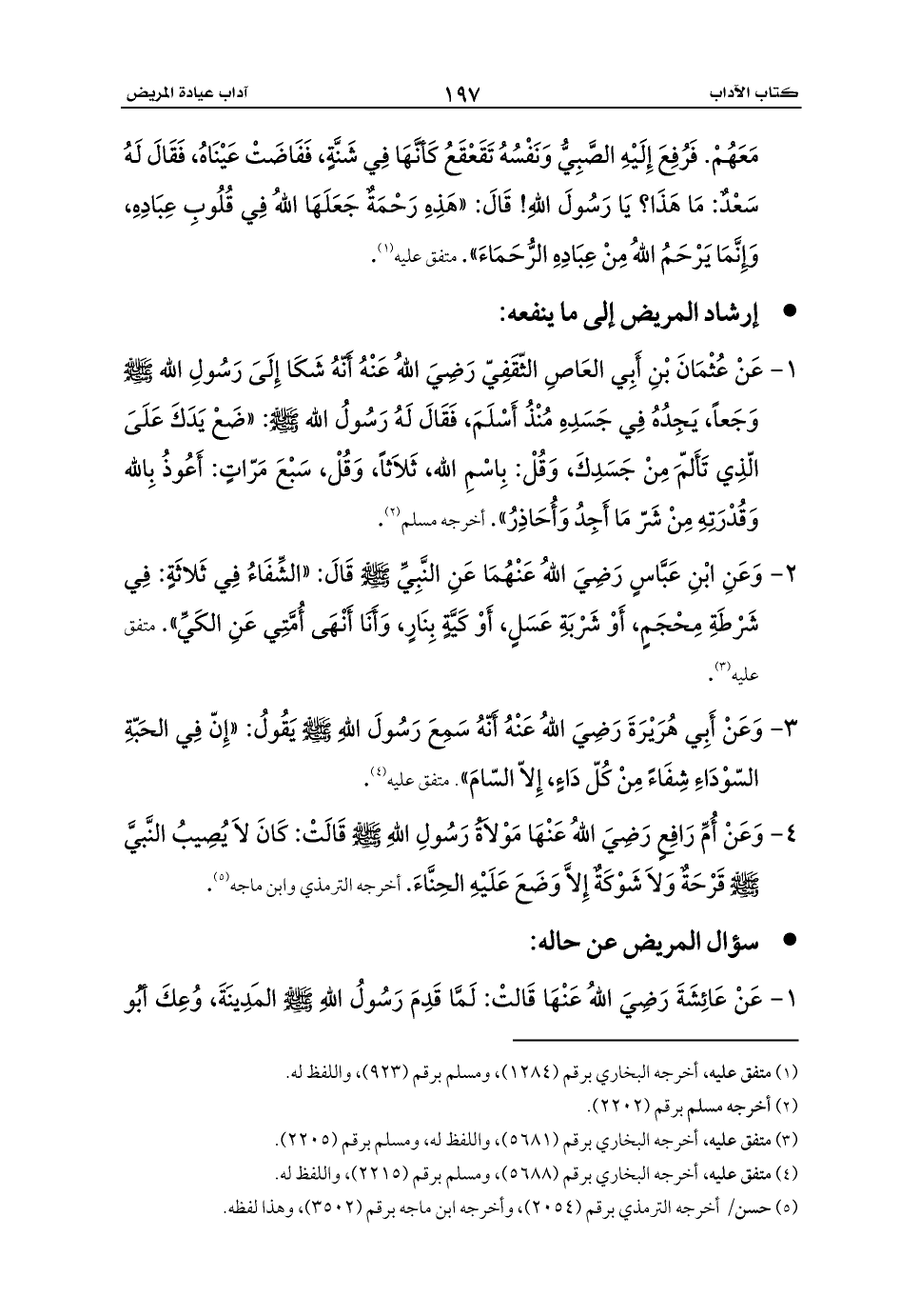 1 - عَنْ عُثْمَانَ بْنِ أَبِي العَاصِ الثّقَفِيّ رَضِيَ اللهُ عَنْهُ أَنّهُ شَكَا إِلَىَ رَسُولِ الله - صلى الله عليه وسلم - وَجَعاً، يَجِدُهُ فِي جَسَدِهِ مُنْذُ أَسْلَمَ، فَقَالَ لَهُ رَسُولُ الله - صلى الله عليه وسلم -: «ضَعْ يَدَكَ عَلَىَ الّذِي تَأَلّمَ مِنْ جَسَدِكَ، وَقُلْ: بِاسْمِ الله، ثَلاَثاً، وَقُلْ، سَبْعَ مَرّاتٍ: أَعُوذُ بِالله وَقُدْرَتِهِ مِنْ شَرّ مَا أَجِدُ وَأُحَاذِرُ». أخرجه مسلم (¬2).
