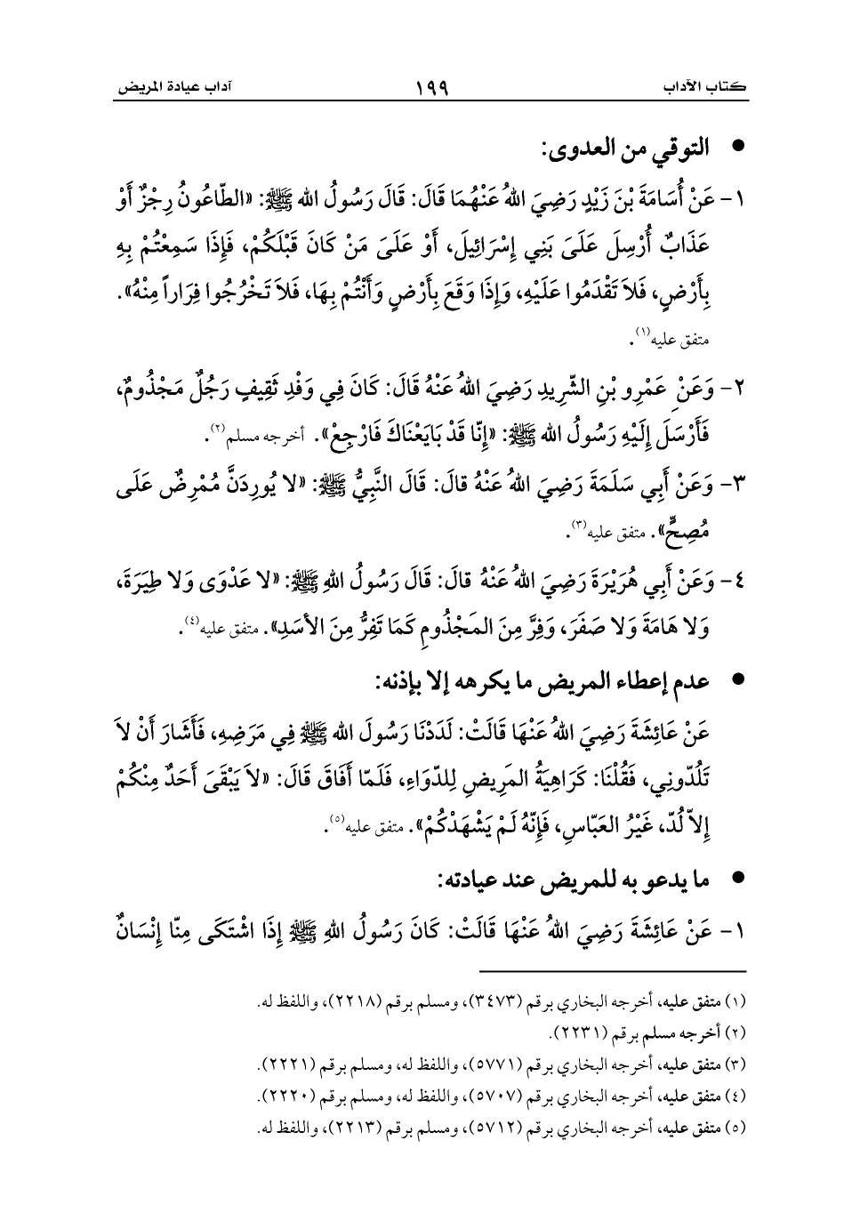 1 - عَنْ أُسَامَةَ بْنَ زَيْدٍ رَضِيَ اللهُ عَنْهُمَا قَالَ: قَالَ رَسُولُ الله - صلى الله عليه وسلم -: «الطّاعُونُ رِجْزٌ أَوْ عَذَابٌ أُرْسِلَ عَلَىَ بَنِي إِسْرَائِيلَ، أَوْ عَلَىَ مَنْ كَانَ قَبْلَكُمْ، فَإِذَا سَمِعْتُمْ بِهِ بِأَرْضٍ، فَلاَ تَقْدَمُوا عَلَيْهِ، وَإِذَا وَقَعَ بِأَرْضٍ وَأَنْتُمْ بِهَا، فَلاَ تَخْرُجُوا فِرَاراً مِنْهُ». متفق عليه (¬1).