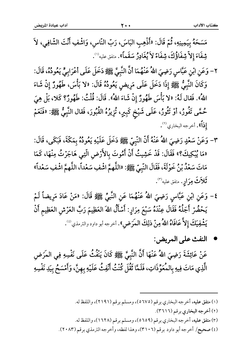 4 - وَعَنِ ابْنِ عَبَّاسٍ رَضِيَ اللهُ عَنْهُمَا عَنِ النَّبيِّ - صلى الله عليه وسلم - قَالَ: «مَنْ عَادَ مَرِيضاً لَمْ يَحْضُرْ أَجَلُهُ فَقَالَ عِنْدَهُ سَبْعَ مِرَارٍ: أَسْأَلُ اللهَ العَظِيمَ رَبَّ العَرْشِ العَظِيمِ أَنْ يَشْفِيَكَ إِلاَّ عَافَاهُ اللهُ مِنْ ذلِكَ المَرَضِ». أخرجه أبو داود والترمذي (¬4).