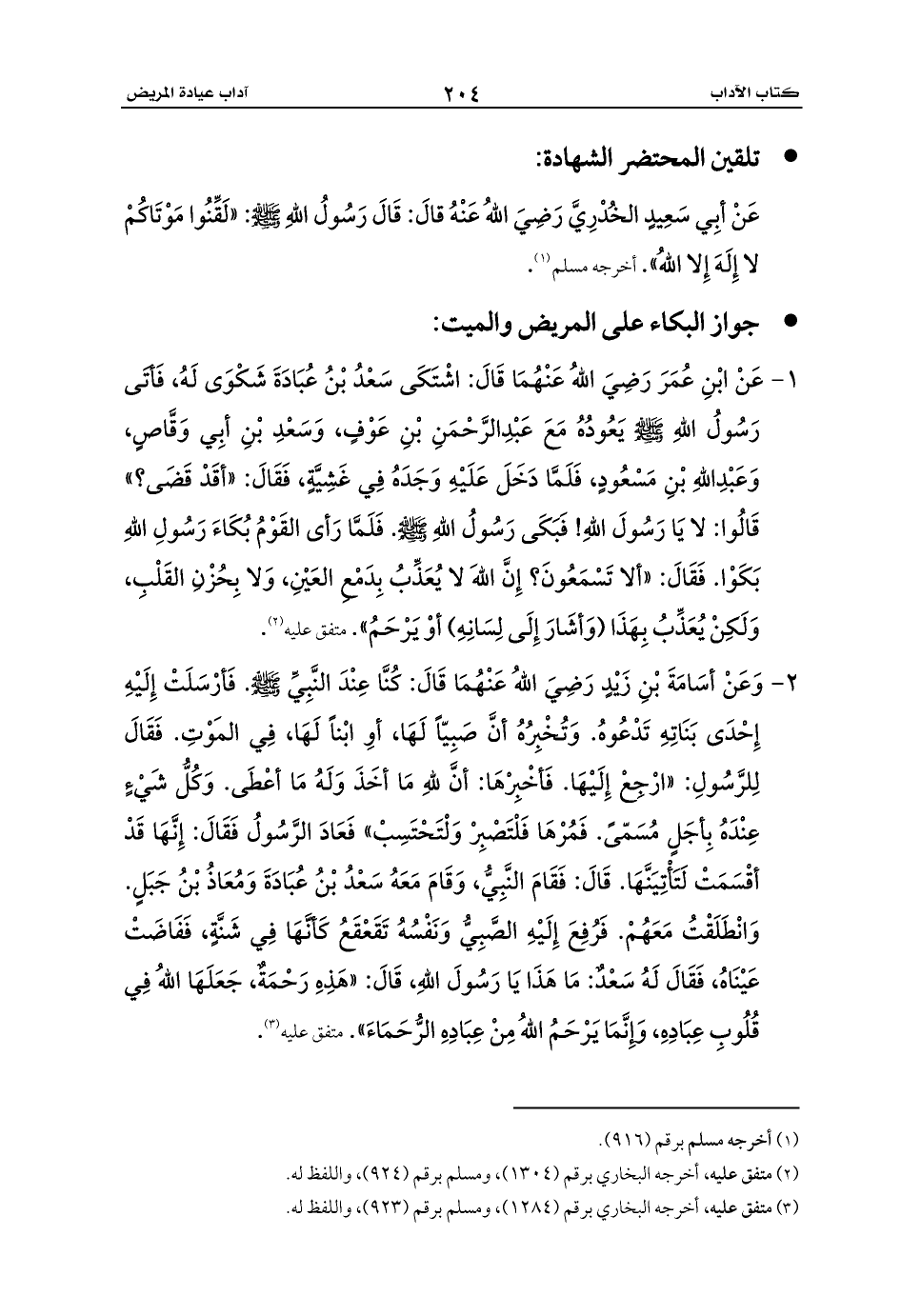 2 - وَعَنْ أسَامَةَ بْنِ زَيْدٍ رَضِيَ اللهُ عَنْهُمَا قَالَ: كُنَّا عِنْدَ النَّبِيِّ - صلى الله عليه وسلم -. فَأرْسَلَتْ إِلَيْهِ إِحْدَى بَنَاتِهِ تَدْعُوهُ. وَتُخْبِرُهُ أنَّ صَبِيّاً لَهَا، أوِ ابْناً لَهَا، فِي المَوْتِ. فَقَالَ لِلرَّسُولِ: «ارْجِعْ إِلَيْهَا. فَأخْبِرْهَا: أنَّ للهِ مَا أخَذَ وَلَهُ مَا أعْطَى. وَكُلُّ شَيْءٍ عِنْدَهُ بِأجَلٍ مُسَمّىً. فَمُرْهَا فَلْتَصْبِرْ وَلْتَحْتَسِبْ» فَعَادَ الرَّسُولُ فَقَالَ: إِنَّهَا قَدْ أقْسَمَتْ لَتَأْتِيَنَّهَا. قَالَ: فَقَامَ النَّبِيُّ، وَقَامَ مَعَهُ سَعْدُ بْنُ عُبَادَةَ وَمُعَاذُ بْنُ جَبَلٍ. وَانْطَلَقْتُ مَعَهُمْ. فَرُفِعَ إِلَيْهِ الصَّبِيُّ وَنَفْسُهُ تَقَعْقَعُ كَأنَّهَا فِي شَنَّةٍ، فَفَاضَتْ عَيْنَاهُ، فَقَالَ لَهُ سَعْدٌ: مَا هَذَا يَا رَسُولَ اللهِ، قَالَ: «هَذِهِ رَحْمَةٌ، جَعَلَهَا اللهُ فِي قُلُوبِ عِبَادِهِ، وَإِنَّمَا يَرْحَمُ اللهُ مِنْ عِبَادِهِ الرُّحَمَاءَ». متفق عليه (¬3).