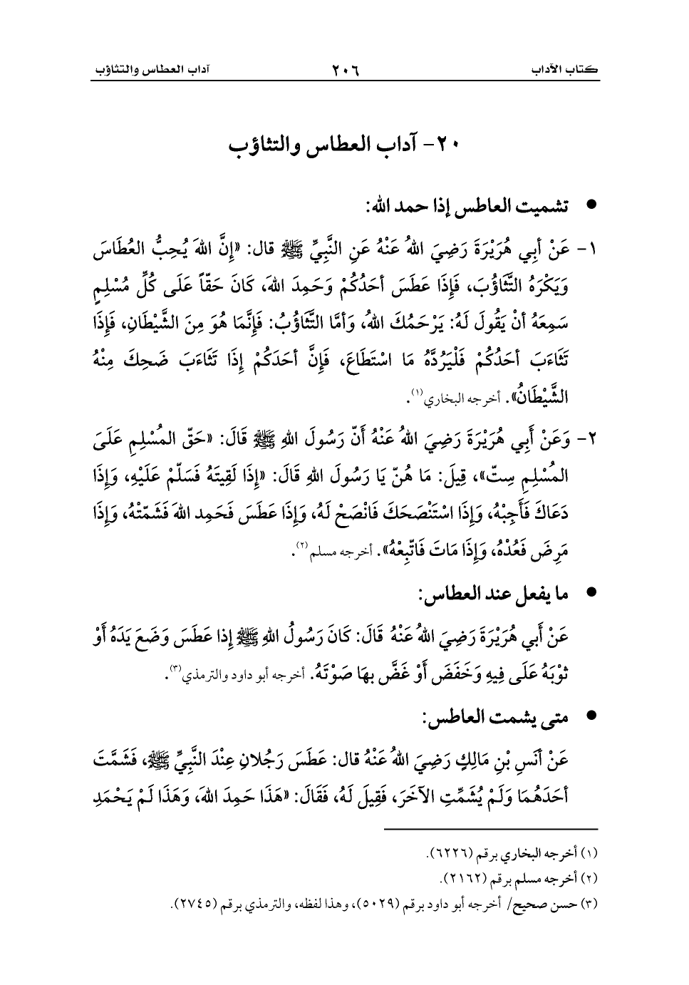 1 - عَنْ أبِي هُرَيْرَةَ رَضِيَ اللهُ عَنْهُ عَنِ النَّبِيِّ - صلى الله عليه وسلم - قال: «إِنَّ اللهَ يُحِبُّ العُطَاسَ وَيَكْرَهُ التَّثَاؤُبَ، فَإِذَا عَطَسَ أحَدُكُمْ وَحَمِدَ اللهَ، كَانَ حَقّاً عَلَى كُلِّ مُسْلِمٍ سَمِعَهُ أنْ يَقُولَ لَهُ: يَرْحَمُكَ اللهُ، وَأمَّا التَّثَاؤُبُ: فَإِنَّمَا هُوَ مِنَ الشَّيْطَانِ، فَإِذَا تَثَاءَبَ أحَدُكُمْ فَلْيَرُدَّهُ مَا اسْتَطَاعَ، فَإِنَّ أحَدَكُمْ إِذَا تَثَاءَبَ ضَحِكَ مِنْهُ الشَّيْطَانُ». أخرجه البخاري (¬1).