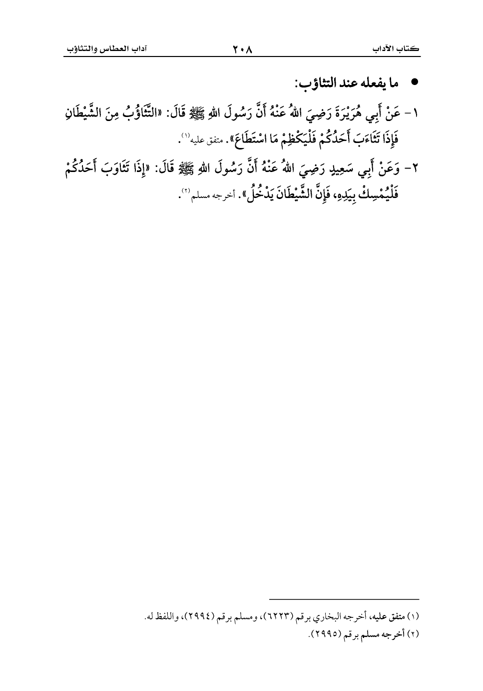 1 - عَنْ أَبِي هُرَيْرَةَ رَضِيَ اللهُ عَنْهُ أَنَّ رَسُولَ اللهِ - صلى الله عليه وسلم - قَالَ: «التَّثَاؤُبُ مِنَ الشَّيْطَانِ فَإِذَا تَثَاءَبَ أَحَدُكُمْ فَلْيَكْظِمْ مَا اسْتَطَاعَ». متفق عليه (¬1).