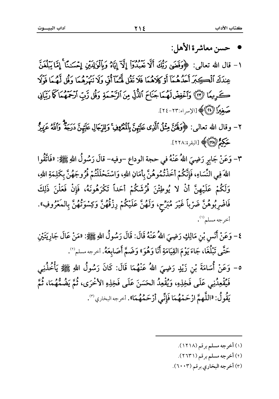 3 - وَعَنْ جَابِرٍ رَضِيَ اللهُ عَنْهُ في حجة الوداع -وفيه- قالَ رَسُولُ اللهِ - صلى الله عليه وسلم -: «فَاتَّقُوا اللهَ فِي النِّسَاءِ، فَإِنَّكُمْ أخَذْتُمُوهُنَّ بِأمَانِ اللهِ، وَاسْتَحْلَلْتُمْ فُرُوجَهُنَّ بِكَلِمَةِ اللهِ، وَلَكُمْ عَلَيْهِنَّ أنْ لا يُوطِئْنَ فُرُشَكُمْ أحَداً تَكْرَهُونَهُ، فَإِنْ فَعَلْنَ ذَلِكَ فَاضْرِبُوهُنَّ ضَرْباً غَيْرَ مُبَرِّحٍ، وَلَهُنَّ عَلَيْكُمْ رِزْقُهُنَّ وَكِسْوَتُهُنَّ بِالمَعْرُوفِ». أخرجه مسلم (¬1).