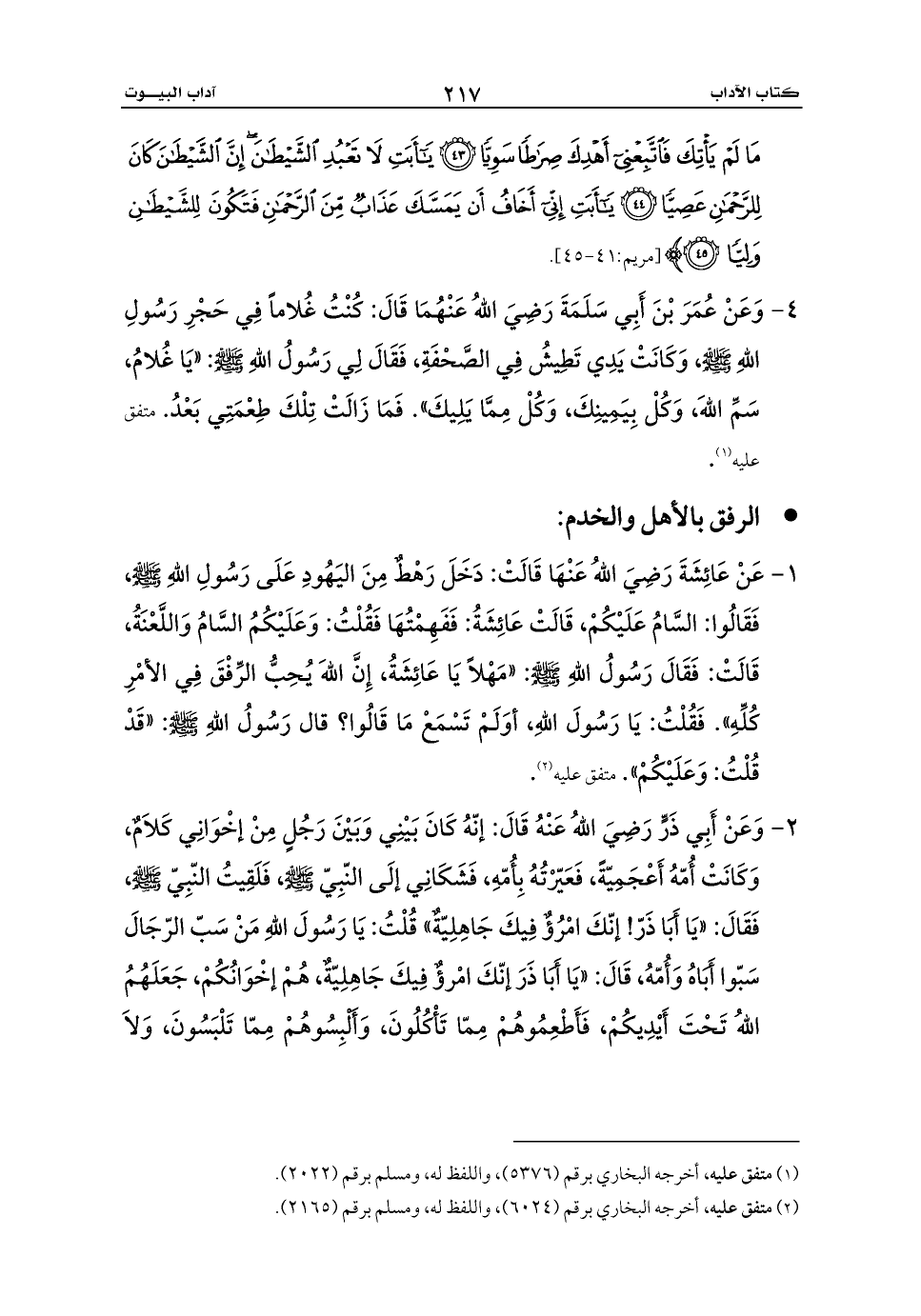 2 - وَعَنْ أَبِي ذَرٍّ رَضِيَ اللهُ عَنْهُ قَالَ: إنّهُ كَانَ بَيْنِي وَبَيْنَ رَجُلٍ مِنْ إخْوَانِي كَلاَمٌ، وَكَانَتْ أُمّهُ أَعْجَمِيّةً، فَعَيّرْتُهُ بِأُمّهِ، فَشَكَانِي إلَى النّبِيّ - صلى الله عليه وسلم -، فَلَقِيتُ النّبِيّ - صلى الله عليه وسلم -، فَقَالَ: «يَا أَبَا ذَرّ! إنّكَ امْرُؤٌ فِيكَ جَاهِلِيّةٌ» قُلْتُ: يَا رَسُولَ اللهِ مَنْ سَبّ الرّجَالَ سَبّوا أَبَاهُ وَأُمّهُ، قَالَ: «يَا أَبَا ذَرَ إنّكَ امْرؤٌ فِيكَ جَاهِلِيّةٌ، هُمْ إخْوَانُكُمْ، جَعَلَهُمُ اللهُ تَحْتَ أَيْدِيكُمْ، فَأَطْعِمُوهُمْ مِمّا تَأْكُلُونَ، وَأَلْبِسُوهُمْ مِمّا تَلْبَسُونَ، وَلاَ