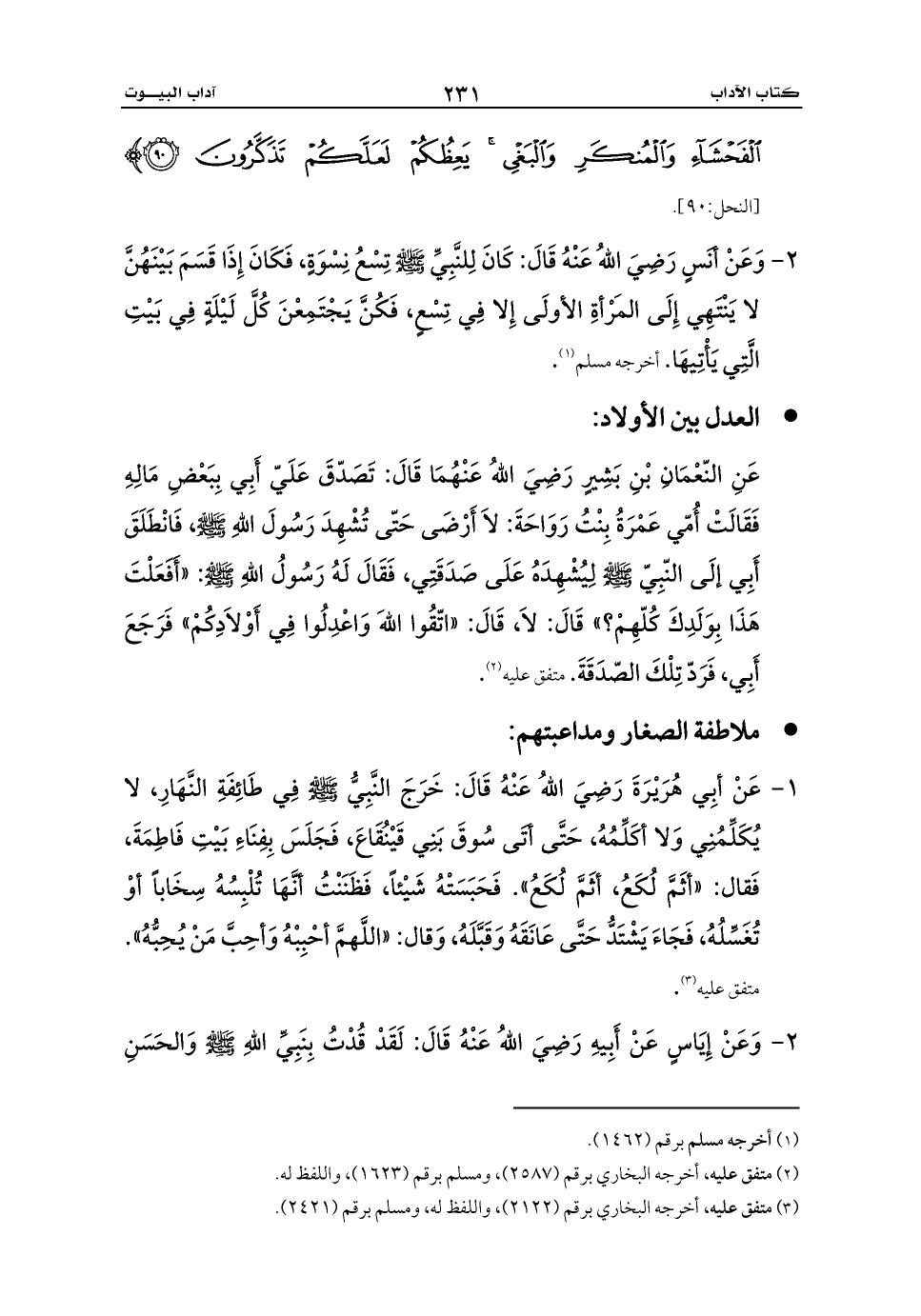 عَنِ النّعْمَانِ بْنِ بَشِيرٍ رَضِيَ اللهُ عَنْهُمَا قَالَ: تَصَدّقَ عَلَيّ أَبِي بِبَعْضِ مَالِهِ فَقَالَتْ أُمّي عَمْرَةُ بِنْتُ رَوَاحَةَ: لاَ أَرْضَى حَتّى تُشْهِدَ رَسُولَ اللهِ - صلى الله عليه وسلم -، فَانْطَلَقَ أَبِي إلَى النّبِيّ - صلى الله عليه وسلم - لِيُشْهِدَهُ عَلَى صَدَقَتِي، فَقَالَ لَهُ رَسُولُ اللهِ - صلى الله عليه وسلم -: «أَفَعَلْتَ هَذَا بِوَلَدِكَ كُلّهِمْ؟» قَالَ: لاَ، قَالَ: «اتّقُوا اللهَ وَاعْدِلُوا فِي أَوْلاَدِكُمْ» فَرَجَعَ أَبِي، فَرَدّ تِلْكَ الصّدَقَةَ. متفق عليه (¬2).
