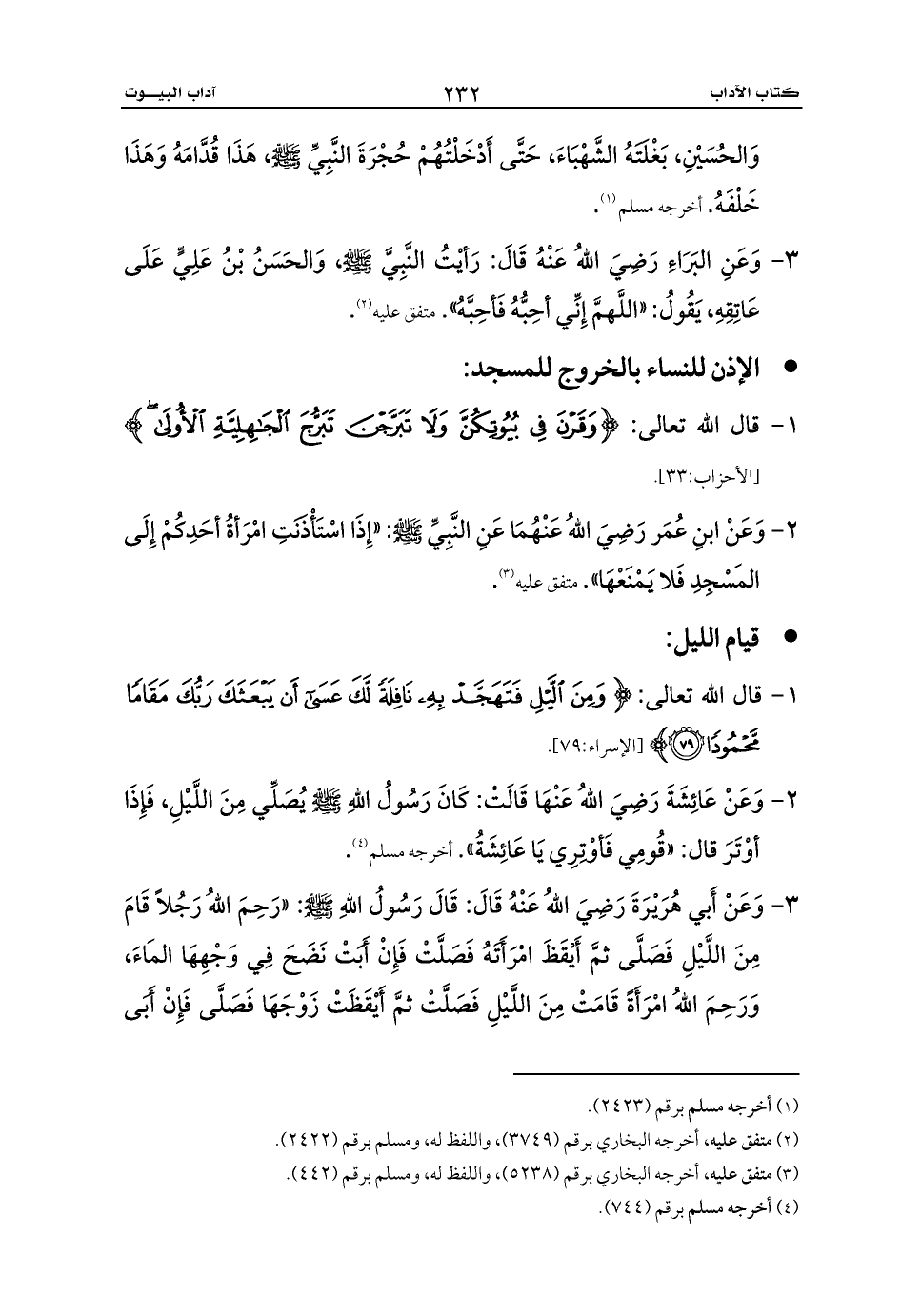 3 - وَعَنِ البَرَاءِ رَضِيَ اللهُ عَنْهُ قَالَ: رَأيْتُ النَّبِيَّ - صلى الله عليه وسلم -، وَالحَسَنُ بْنُ عَلِيٍّ عَلَى عَاتِقِهِ، يَقُولُ: «اللَّهمَّ إِنِّي أحِبُّهُ فَأحِبَّهُ». متفق عليه (¬2).