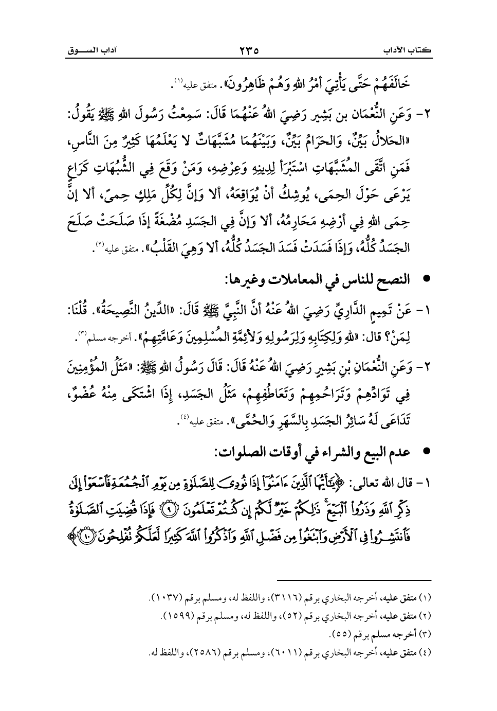 1 - قال الله تعالى: {يَاأَيُّهَا الَّذِينَ آمَنُوا إِذَا نُودِيَ لِلصَّلَاةِ مِنْ يَوْمِ الْجُمُعَةِ فَاسْعَوْا إِلَى ذِكْرِ اللَّهِ وَذَرُوا الْبَيْعَ ذَلِكُمْ خَيْرٌ لَكُمْ إِنْ كُنْتُمْ تَعْلَمُونَ (9) فَإِذَا قُضِيَتِ الصَّلَاةُ فَانْتَشِرُوا فِي الْأَرْضِ وَابْتَغُوا مِنْ فَضْلِ اللَّهِ وَاذْكُرُوا اللَّهَ كَثِيرًا لَعَلَّكُمْ تُفْلِحُونَ (10)}