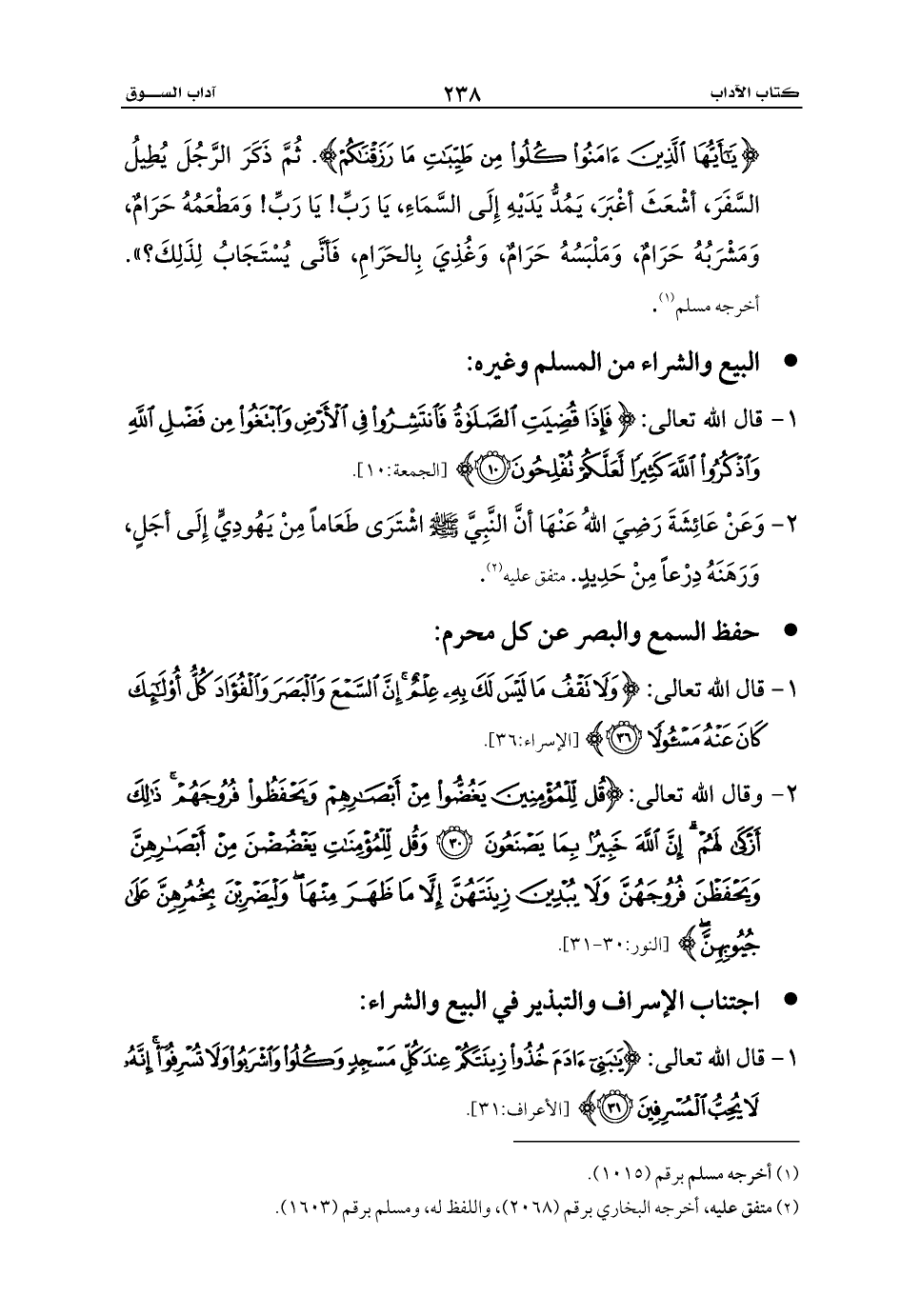 1 - قال الله تعالى: {يَابَنِي آدَمَ خُذُوا زِينَتَكُمْ عِنْدَ كُلِّ مَسْجِدٍ وَكُلُوا وَاشْرَبُوا وَلَا تُسْرِفُوا إِنَّهُ