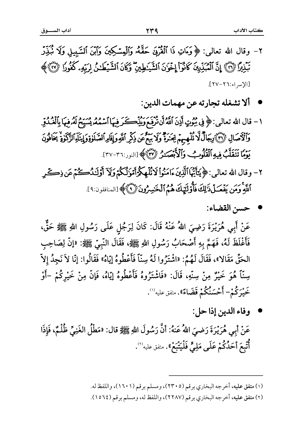 2 - وقال الله تعالى: {وَآتِ ذَا الْقُرْبَى حَقَّهُ وَالْمِسْكِينَ وَابْنَ السَّبِيلِ وَلَا تُبَذِّرْ تَبْذِيرًا (26) إِنَّ الْمُبَذِّرِينَ كَانُوا إِخْوَانَ الشَّيَاطِينِ وَكَانَ الشَّيْطَانُ لِرَبِّهِ كَفُورًا (27)} [الإسراء:26 - 27].