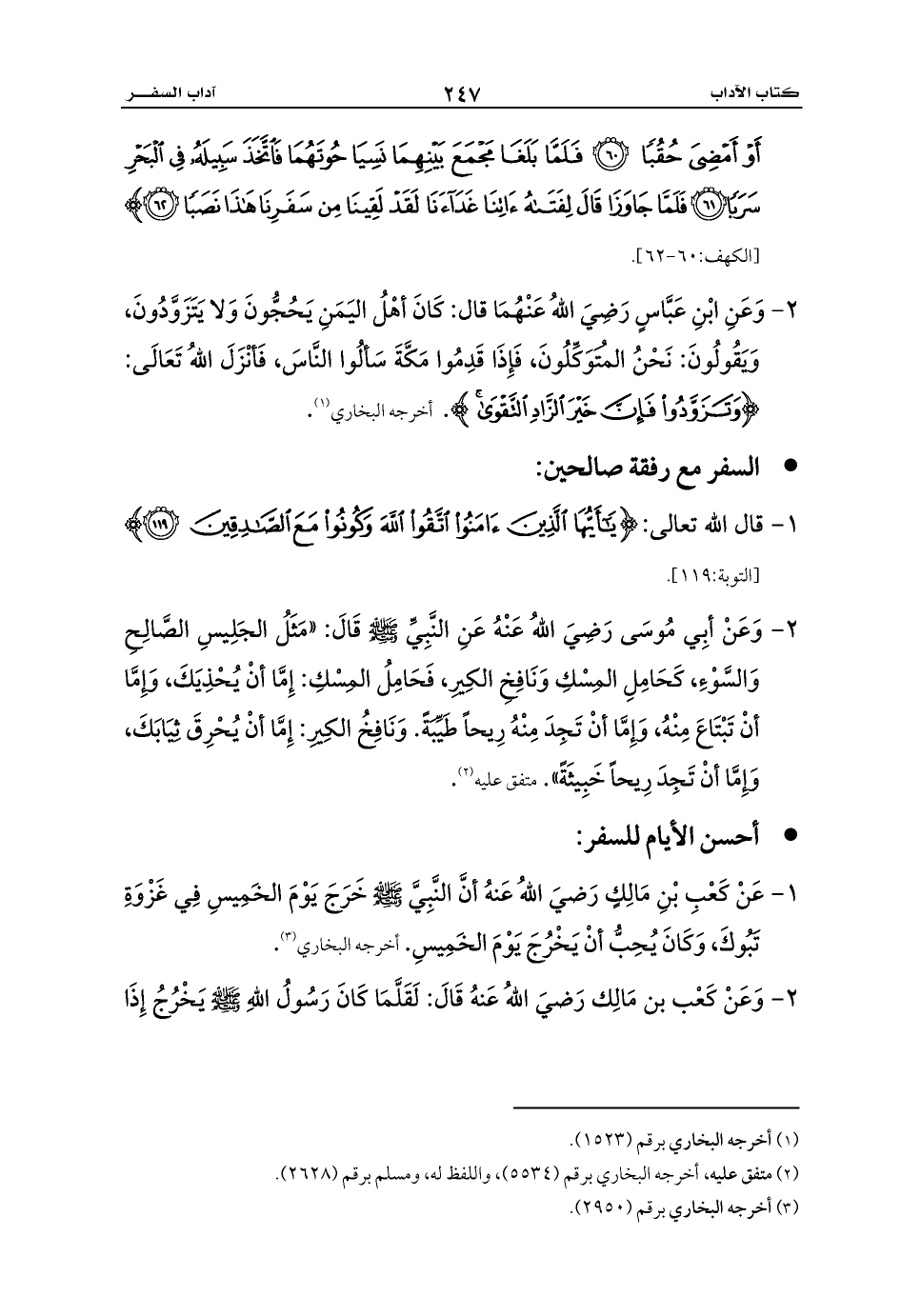 1 - عَنْ كَعْبِ بْنِ مَالِكٍ رَضيَ اللهُ عَنهُ أنَّ النَّبِيَّ - صلى الله عليه وسلم - خَرَجَ يَوْمَ الخَمِيسِ فِي غَزْوَةِ تَبُوكَ، وَكَانَ يُحِبُّ أنْ يَخْرُجَ يَوْمَ الخَمِيسِ. أخرجه البخاري (¬3).
