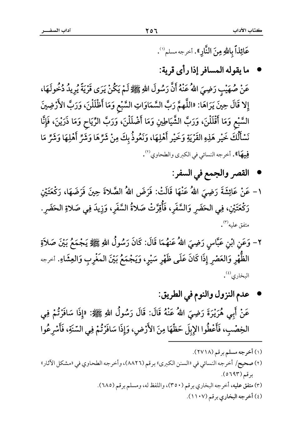 عَنْ صُهَيْبٍ رَضِيَ اللهُ عَنْهُ أَنَّ رَسُولَ اللهِ - صلى الله عليه وسلم - لَمْ يَكُنْ يَرَى قَرْيَةً يُرِيدُ دُخُولَهَا، إِلا قَالَ حِينَ يَرَاهَا: «اللَّهمَّ رَبَّ السَّمَاوَاتِ السَّبْعِ وَمَا أَظْلَلْنَ، وَرَبَّ الأَرْضِينَ السَّبْعِ وَمَا أَقْلَلْنَ، وَرَبَّ الشَّيَاطِينِ وَمَا أَضْلَلْنَ، وَرَبَّ الرِّيَاحِ وَمَا ذَرَيْنَ، فَإِنَّا نَسْأَلُكَ خَيْر هَذِهِ القَرْيَةِ وَخَيْر أَهْلِهَا، وَنَعُوذُ بِكَ مِنْ شَرِّهَا وَشَرِّ أَهْلِهَا وَشَرِّ مَا فِيهَا». أخرجه النسائي في الكبرى والطحاوي (¬2).