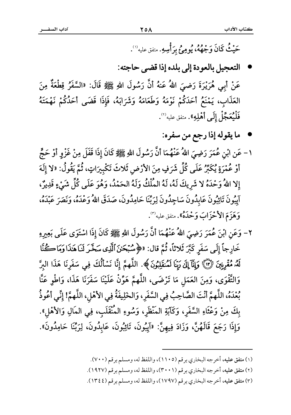 1 - عَن ابْنِ عُمَرَ رَضِيَ اللهُ عَنْهُمَا أنَّ رَسُولَ اللهِ - صلى الله عليه وسلم - كَانَ إِذَا قَفَلَ مِنْ غَزْوٍ أوْ حَجٍّ أوْ عُمْرَةٍ يُكَبِّرُ عَلَى كُلِّ شَرَفٍ مِنَ الأرْضِ ثَلاثَ تَكْبِيرَاتٍ، ثُمَّ يَقُولُ: «لا إِلَهَ إِلا اللهُ وَحْدَهُ لا شَرِيكَ لَهُ، لَهُ المُلْكُ وَلَهُ الحَمْدُ، وَهُوَ عَلَى كُلِّ شَيْءٍ قَدِيرٌ، آيِبُونَ تَائِبُونَ عَابِدُونَ سَاجِدُونَ لِرَبِّنَا حَامِدُونَ، صَدَقَ اللهُ وَعْدَهُ، وَنَصَرَ عَبْدَهُ، وَهَزَمَ الأحْزَابَ وَحْدَهُ». متفق عليه (¬3).