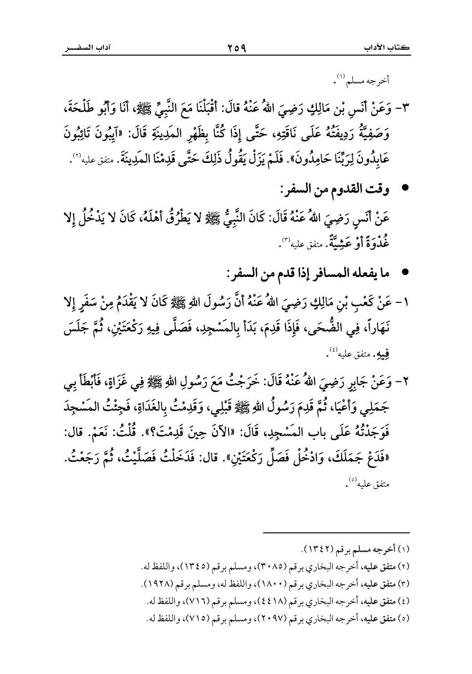 1 - عَنْ كَعْبِ بْنِ مَالِكٍ رَضِيَ اللهُ عَنْهُ أنَّ رَسُولَ اللهِ - صلى الله عليه وسلم - كَانَ لا يَقْدَمُ مِنْ سَفَرٍ إِلا نَهَاراً، فِي الضُّحَى، فَإِذَا قَدِمَ، بَدَأ بِالمَسْجِدِ، فَصَلَّى فِيهِ رَكْعَتَيْنِ، ثُمَّ جَلَسَ فِيهِ. متفق عليه (¬4).