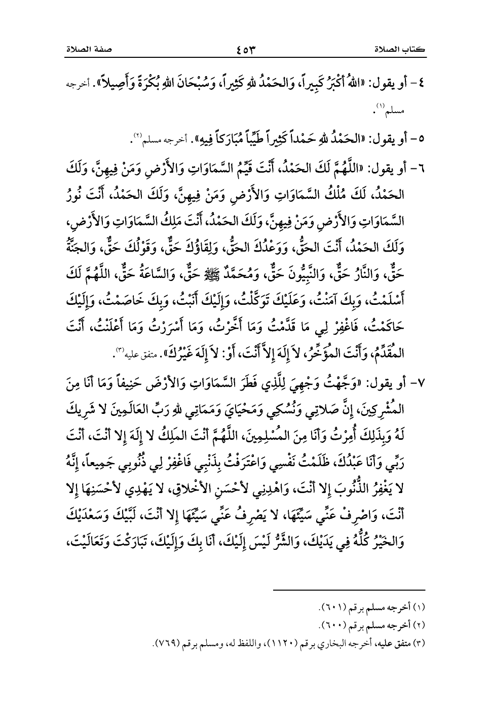 7 - أو يقول: «وَجَّهْتُ وَجْهِيَ لِلَّذِي فَطَرَ السَّمَاوَاتِ وَالأرْضَ حَنِيفاً وَمَا أنَا مِنَ المُشْرِكِينَ، إِنَّ صَلاتِي وَنُسُكِي وَمَحْيَايَ وَمَمَاتِي للهِ رَبِّ العَالَمِينَ لا شَرِيكَ لَهُ وَبِذَلِكَ أُمِرْتُ وَأنَا مِنَ المُسْلِمِينَ، اللَّهُمَّ أنْتَ المَلِكُ لا إِلَهَ إِلا أنْتَ، أنْتَ رَبِّي وَأنَا عَبْدُكَ، ظَلَمْتُ نَفْسِي وَاعْتَرَفْتُ بِذَنْبِي فَاغْفِرْ لِي ذُنُوبِي جَمِيعاً، إِنَّهُ لا يَغْفِرُ الذُّنُوبَ إِلا أنْتَ، وَاهْدِنِي لأحْسَنِ الأخْلاقِ، لا يَهْدِي لأحْسَنِهَا إِلا أنْتَ، وَاصْرِفْ عَنِّي سَيِّئَهَا، لا يَصْرِفُ عَنِّي سَيِّئَهَا إِلا أنْتَ، لَبَّيْكَ وَسَعْدَيْكَ