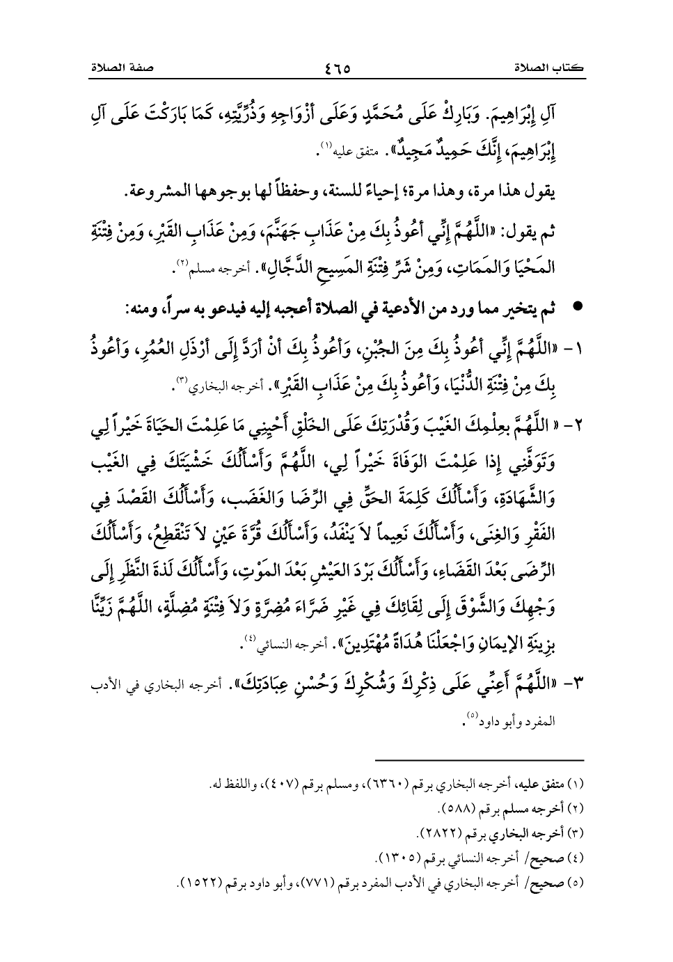 ثم يقول: «اللَّهُمَّ إِنِّي أعُوذُ بِكَ مِنْ عَذَابِ جَهَنَّمَ، وَمِنْ عَذَابِ القَبْرِ، وَمِنْ فِتْنَةِ المَحْيَا وَالمَمَاتِ، وَمِنْ شَرِّ فِتْنَةِ المَسِيحِ الدَّجَّالِ». أخرجه مسلم (¬2).