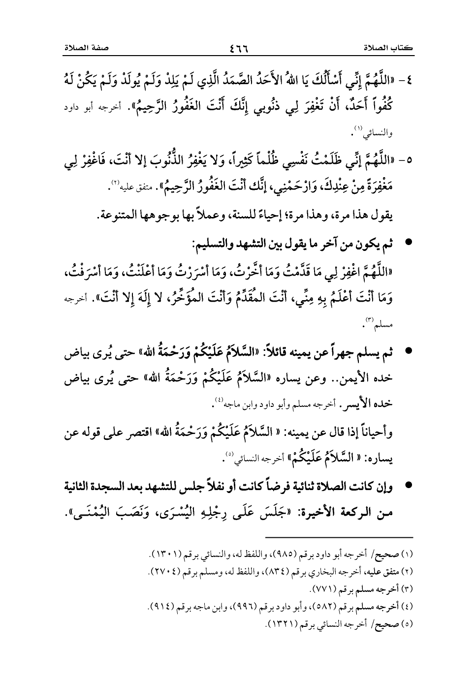 4 - «اللَّهُمَّ إِنِّي أَسْأَلُكَ يَا اللهُ الأَحَدُ الصَّمَدُ الَّذِي لَمْ يَلِدْ وَلَمْ يُولَدْ وَلَمْ يَكُنْ لَهُ كُفُواً أَحَدٌ، أَنْ تَغْفِرَ لِي ذنُوبي إِنَّكَ أَنْتَ الغَفُورُ الرَّحِيمُ». أخرجه أبو داود والنسائي (¬1).